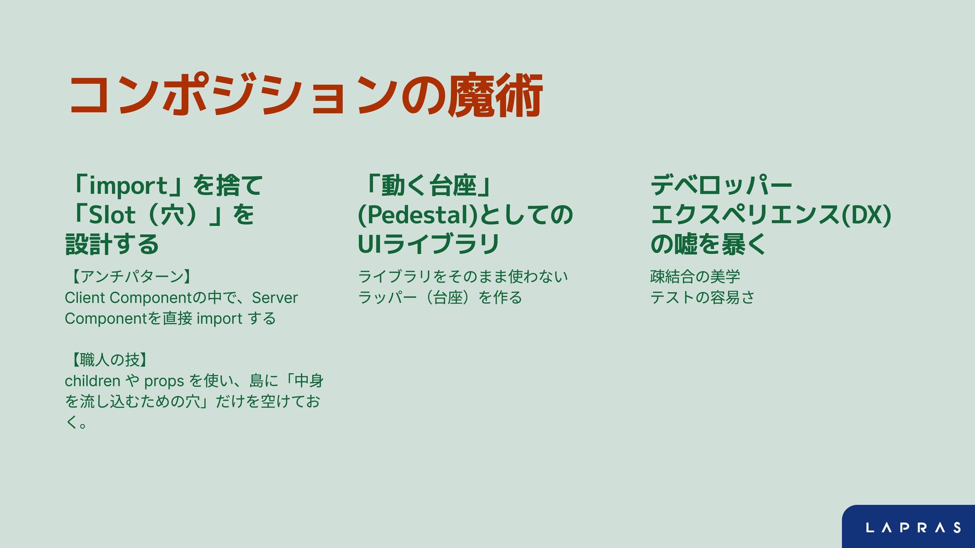【職人の技】 children や props を使い、島に「中身 を流し込むための穴」だけを空けてお く。 「動く台座」 (Pedestal)としての UIライブラリ ライブラリをそのまま使わない ラッパー(台座)を作る デベロッパー エクスペリエンス(DX) の嘘を暴く 疎結合の美学 テストの容易さ
