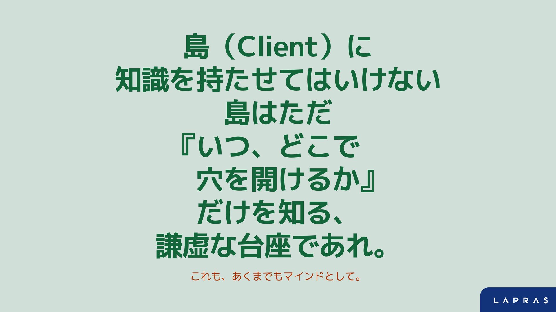 島(Client)に 知識を持たせてはいけない 島はただ 『いつ、どこで 穴を開けるか』 だけを知る、 謙虚な台座であれ。 これも、あくまでもマインドとして。
