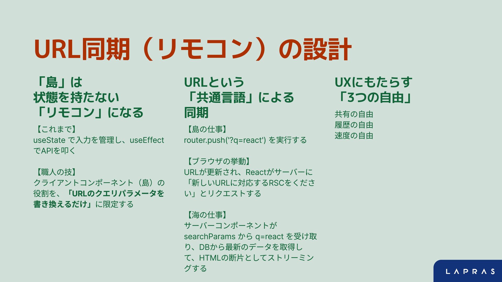 URL同期(リモコン)の設計 「島」は 状態を持たない 「リモコン」になる URLという 「共通言語」による 同期 UXにもたらす 「3つの自由」 共有の自由