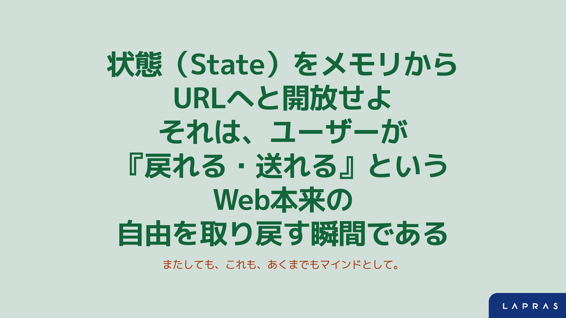 状態(State)をメモリから URLへと開放せよ それは、ユーザーが 『戻れる・送れる』という Web本来の 自由を取り戻す瞬間である またしても、これも、あくまでもマインドとして。