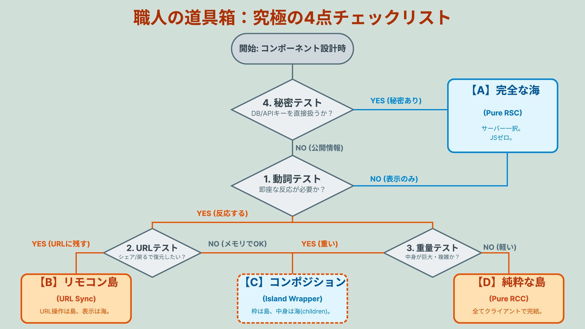 YES (秘密あり) 4. 秘密テスト DB/APIキーを直接扱うか? NO (公開情報) 1. 動詞テスト 即座な反応が必要か? NO (表示 のみ ) YES (反応する ) NO (メ モリで OK ) YES (重い ) 2. URLテスト シェア/戻るで復元したい? 3. 重量テスト 中身が巨大・複雑か? 【C】コンポジション (Island Wrapper) 枠は島、中身は海(children)。 【A】完全な海 (Pure RSC) サーバー一択。 JSゼロ。 NO (軽い ) 【D】純粋な島 (Pure RCC) 全てクライアントで完結。