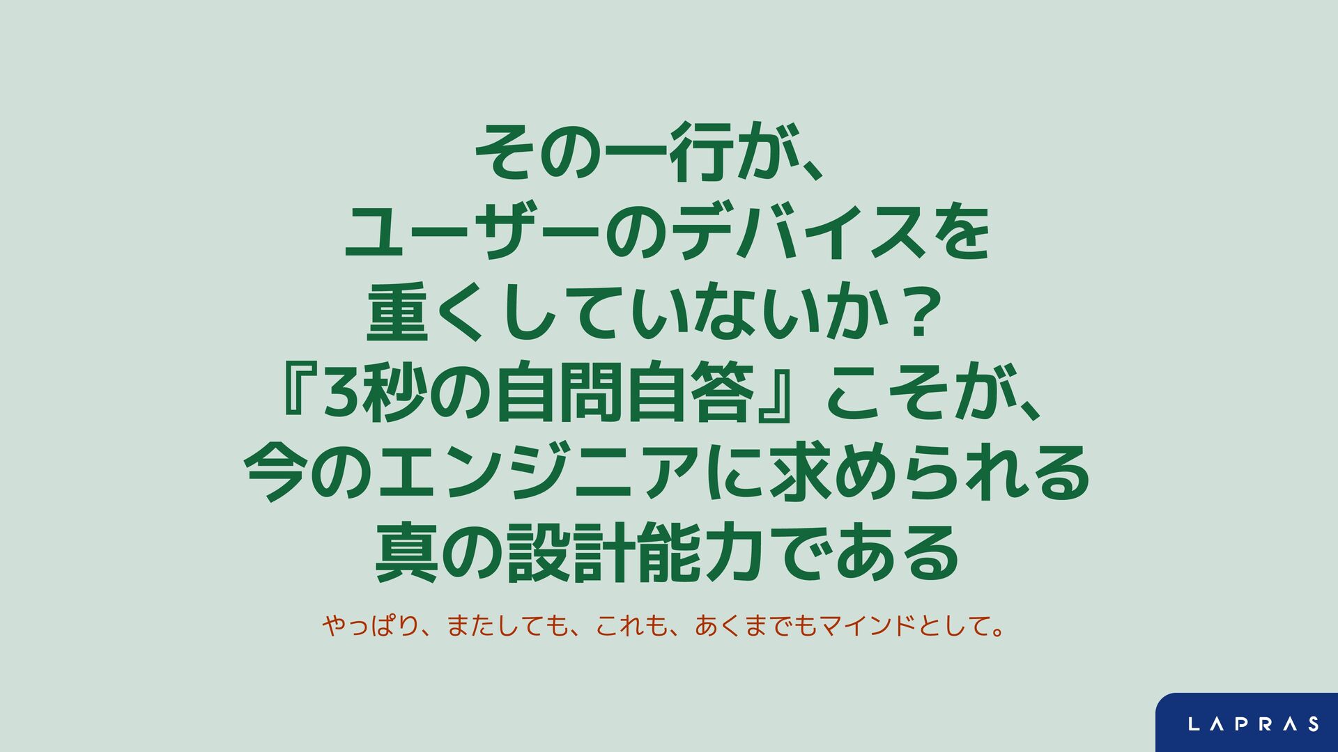 その一行が、 ユーザーのデバイスを 重くしていないか? 『3秒の自問自答』こそが、 今のエンジニアに求められる 真の設計能力である やっぱり、またしても、これも、あくまでもマインドとして。