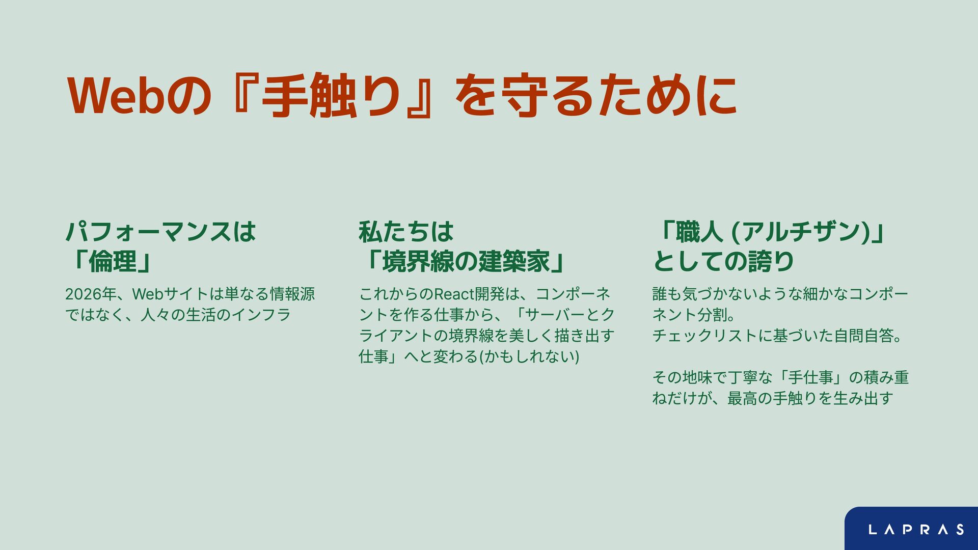 Webの『手触り』を守るために パフォーマンスは 「倫理」 2026年、Webサイトは単なる情報源 ではなく、人々の生活のインフラ 私たちは 「境界線の建築家」 これからのReact開発は、コンポーネ ントを作る仕事から、「サーバーとク ライアントの境界線を美しく描き出す