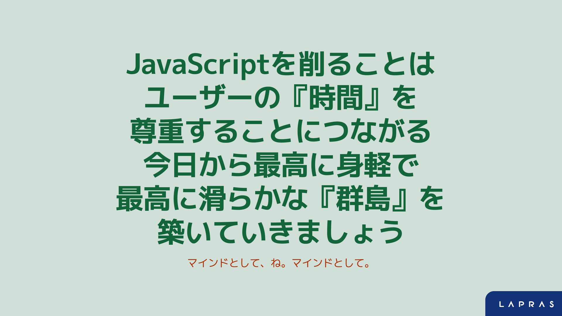 JavaScriptを削ることは ユーザーの『時間』を 尊重することにつながる 今日から最高に身軽で 最高に滑らかな『群島』を 築いていきましょう マインドとして、ね。マインドとして。