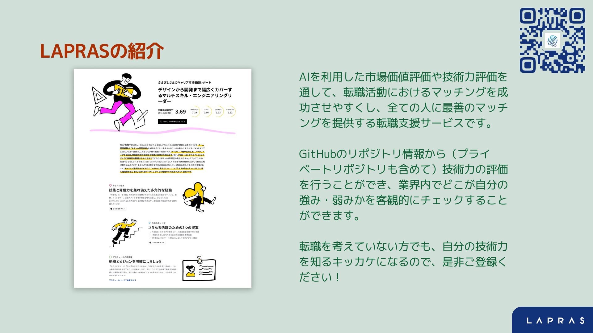 LAPRASの紹介 AIを利用した市場価値評価や技術力評価を 通して、転職活動におけるマッチングを成 功させやすくし、全ての人に最善のマッチ ングを提供する転職支援サービスです。 GitHubのリポジトリ情報から(プライ ベートリポジトリも含めて)技術力の評価 を行うことができ、業界内でどこが自分の 強み・弱みかを客観的にチェックすること ができます。