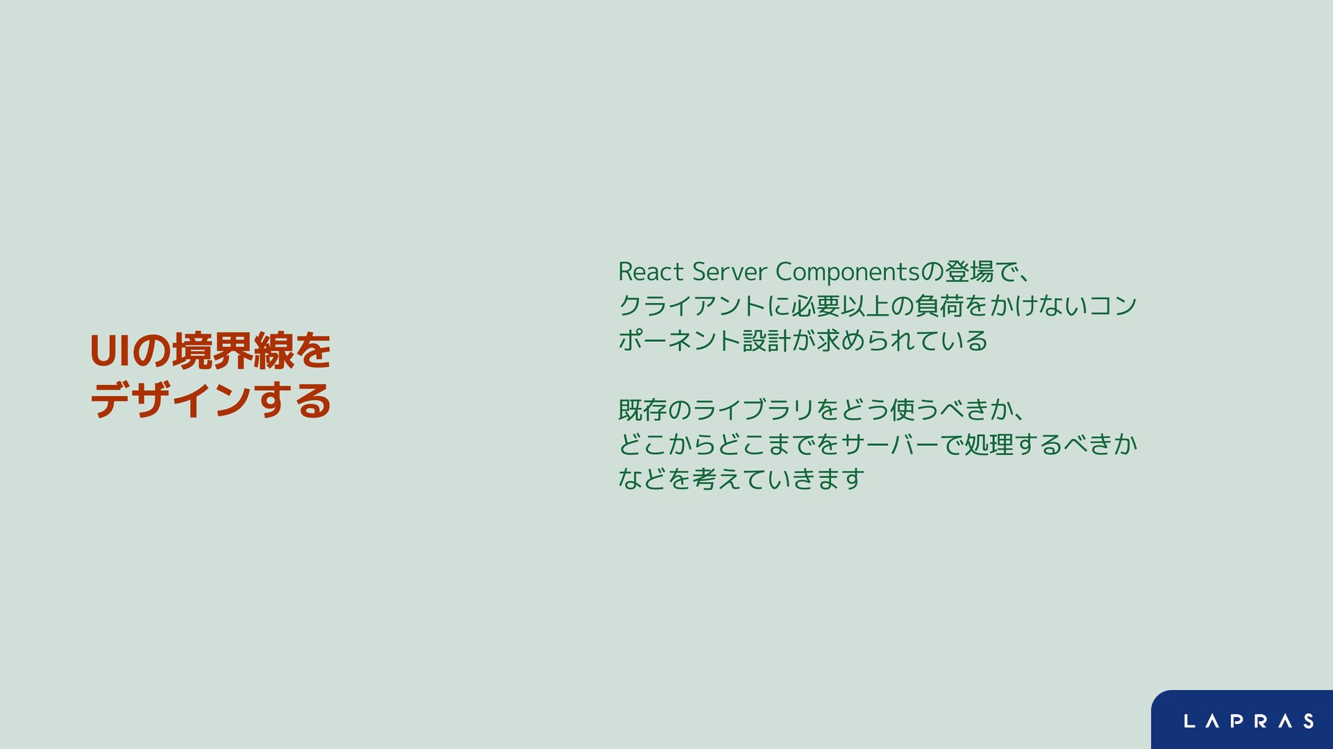 UIの境界線を デザインする React Server Componentsの登場で、 クライアントに必要以上の負荷をかけないコン ポーネント設計が求められている 既存のライブラリをどう使うべきか、 どこからどこまでをサーバーで処理するべきか などを考えていきます