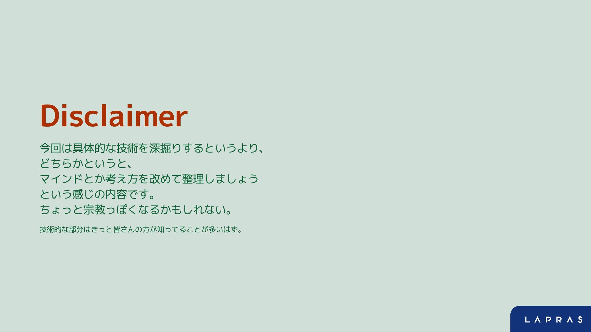 Disclaimer 今回は具体的な技術を深掘りするというより、 どちらかというと、 マインドとか考え方を改めて整理しましょう という感じの内容です。 ちょっと宗教っぽくなるかもしれない。 技術的な部分はきっと皆さんの方が知ってることが多いはず。