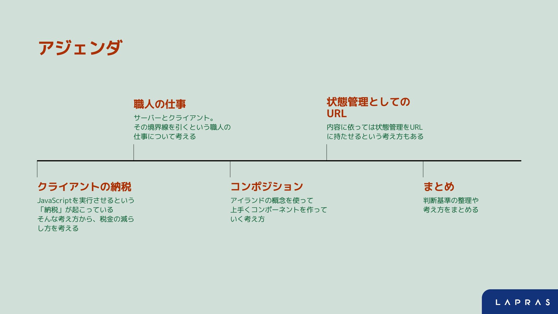 アジェンダ 状態管理としての URL 内容に依っては状態管理をURL に持たせるという考え方もある 職人の仕事 サーバーとクライアント。 その境界線を引くという職人の 仕事について考える クライアントの納税