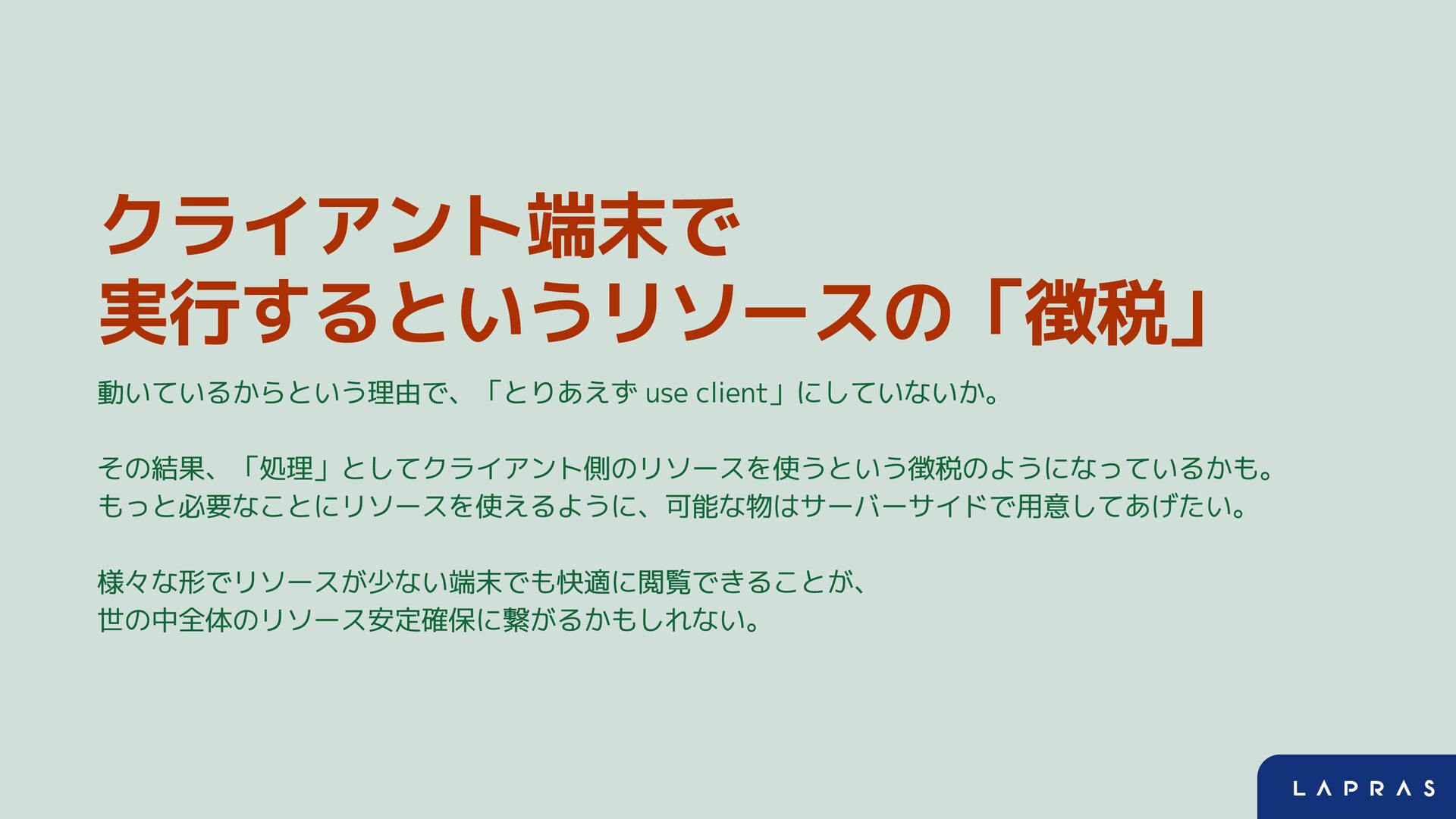 クライアント端末で 実行するというリソースの「徴税」 動いているからという理由で、「とりあえず use client」にしていないか。 その結果、「処理」としてクライアント側のリソースを使うという徴税のようになっているかも。 もっと必要なことにリソースを使えるように、可能な物はサーバーサイドで用意してあげたい。 様々な形でリソースが少ない端末でも快適に閲覧できることが、 世の中全体のリソース安定確保に繋がるかもしれない。