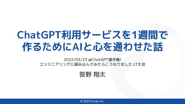 © 2023 Findy Inc. ChatGPT利用サービスを1週間で 作るためにAIと心を通わせた話 2022/03/23 @ChatGPT選手権! エンジニアリングに組み込んでみたらこうなりました LT大会