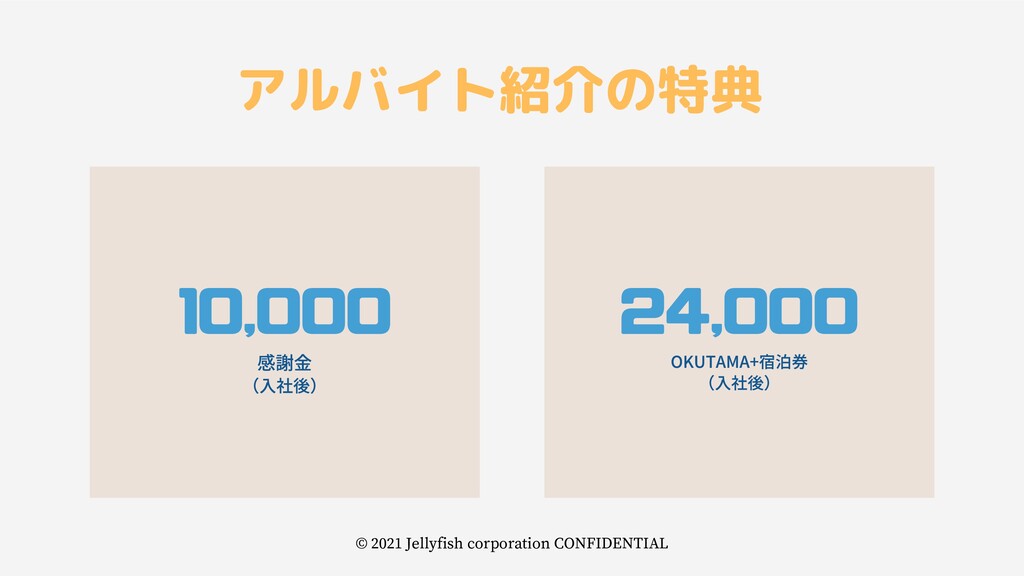 感謝金 (入社後) 10,000 OKUTAMA+宿泊券 (入社後) 24,000 アルバイト紹介の特典 © 2021 Jellyfish