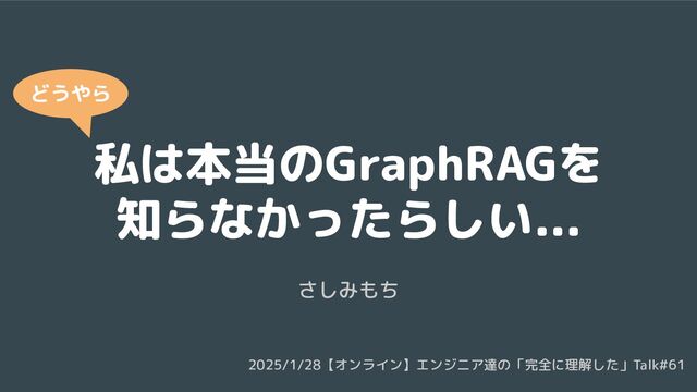 私は本当のGraphRAGを 知らなかったらしい... さしみもち 2025/1/28【オンライン】エンジニア達の「完全に理解した」Talk#61 どうやら