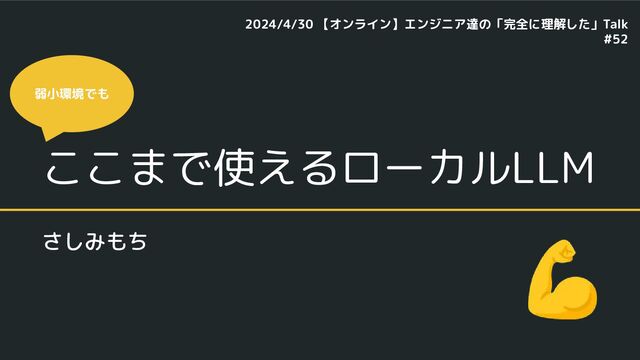 ここまで使えるローカルLLM さしみもち 弱小環境でも 💪 2024/4/30 【オンライン】エンジニア達の「完全に理解した」Talk #52