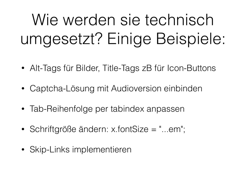 Bilder, Title-Tags zB für Icon-Buttons • Captcha-Lösung mit Audioversion einbinden • Tab-Reihenfolge per tabindex anpassen • Schriftgröße ändern: x.fontSize = "...em"; • Skip-Links implementieren
