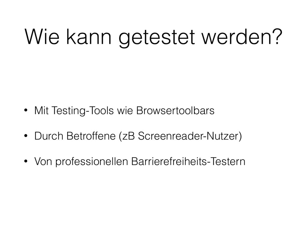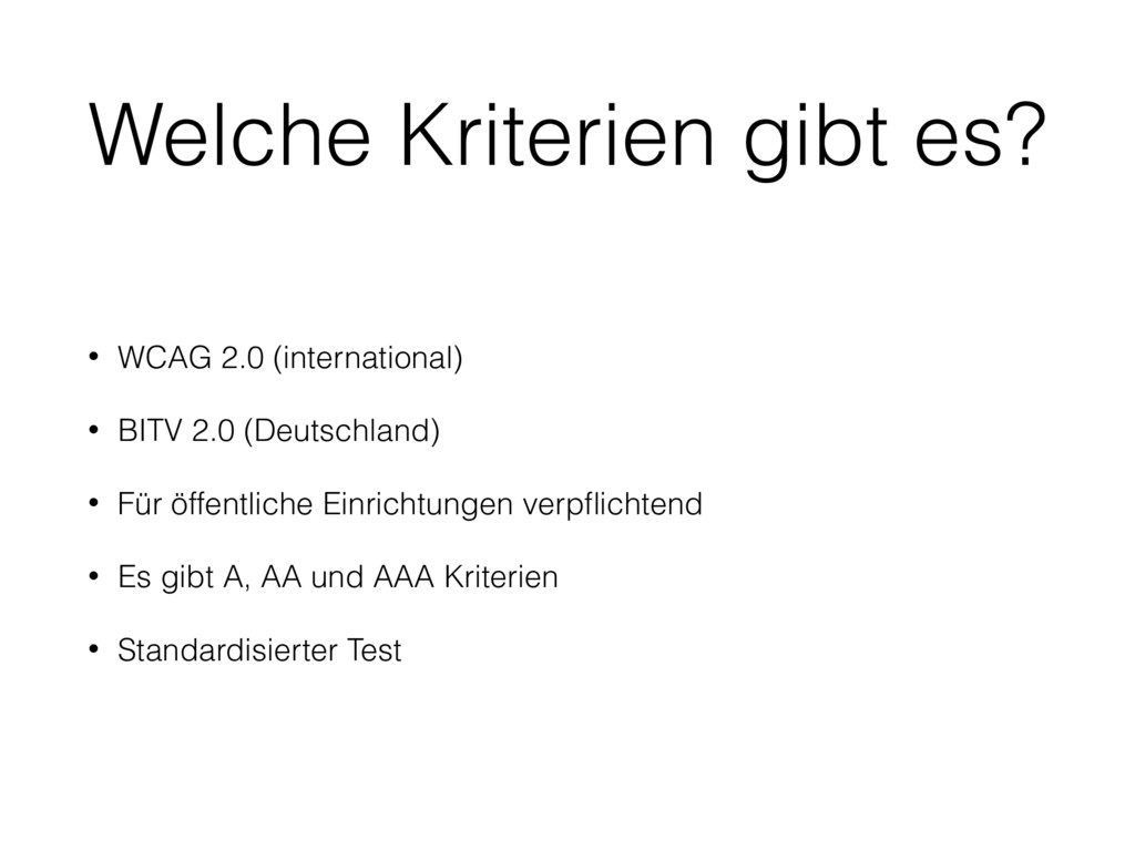 2.0 (Deutschland) • Für öffentliche Einrichtungen verpflichtend • Es gibt A, AA und AAA Kriterien • Standardisierter Test