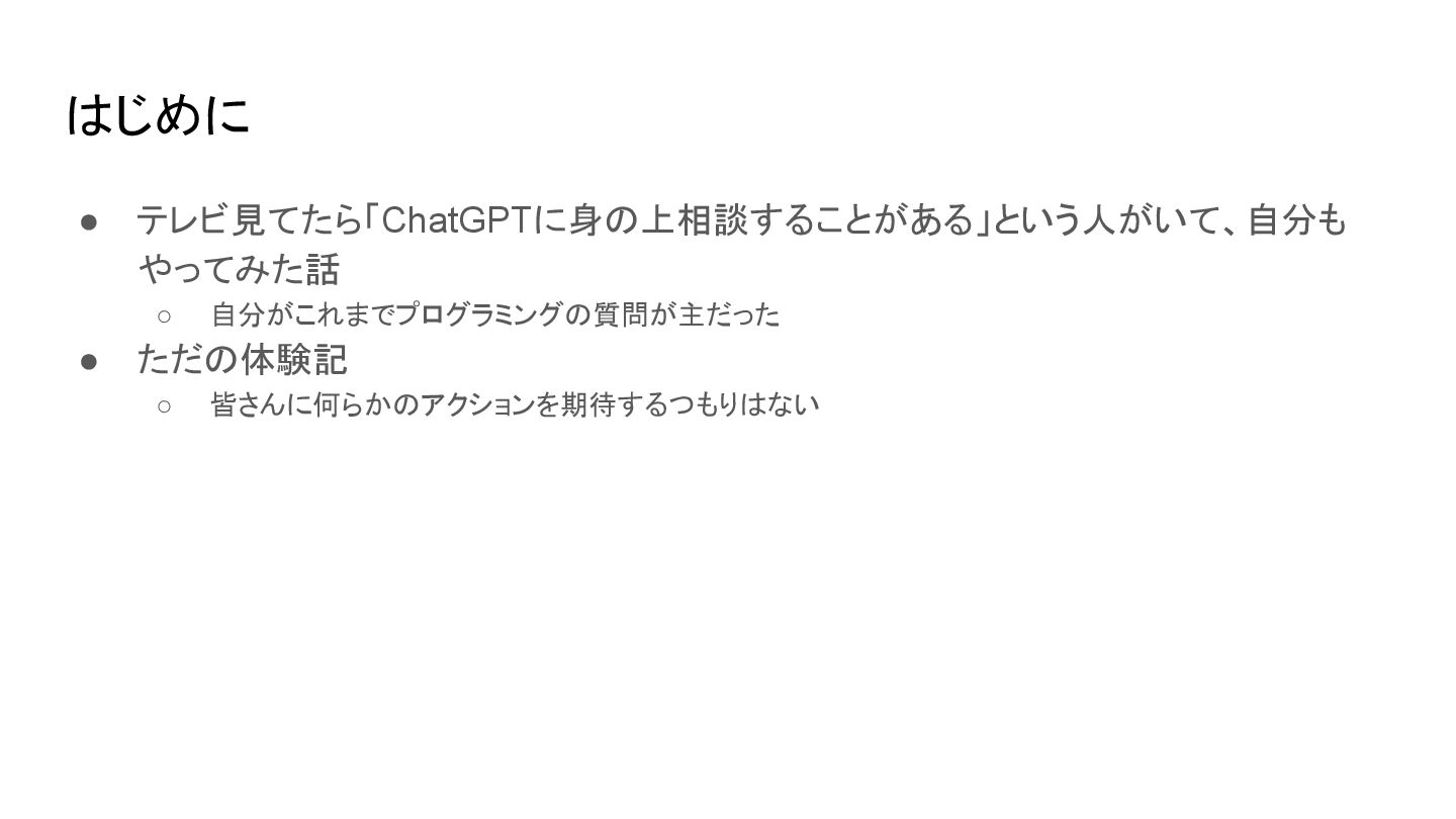 はじめに • テレビ見てたら「ChatGPTに身の上相談することがある」という人がいて、自分も やってみた話 ◦ 自分がこれまでプログラミングの質問が主だった • ただの体験記 ◦ 皆さんに何らかのアクションを期待するつもりはない