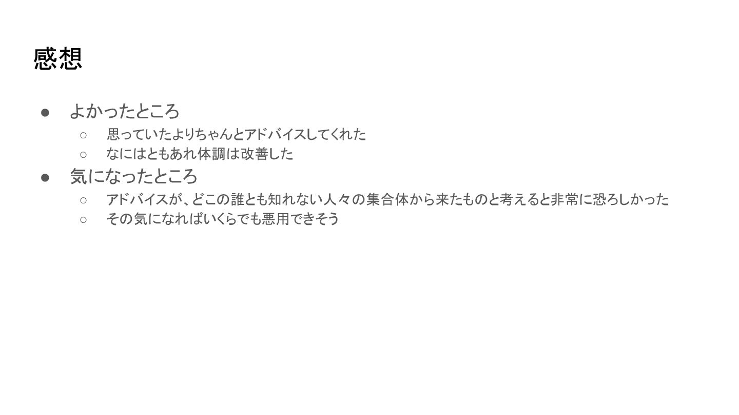 感想 • よかったところ ◦ 思っていたよりちゃんとアドバイスしてくれた ◦ なにはともあれ体調は改善した • 気になったところ ◦