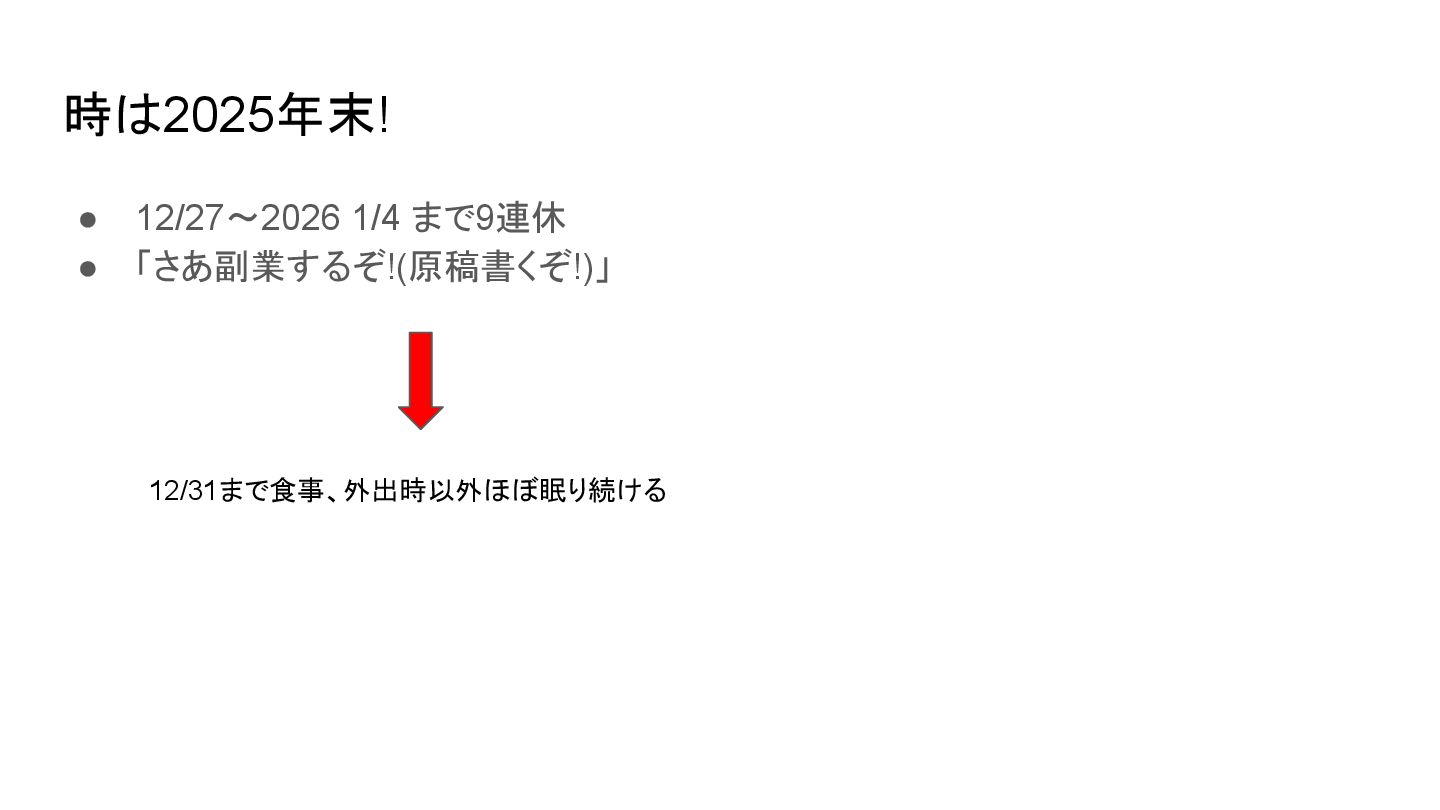 時は2025年末! • 12/27~2026 1/4 まで9連休 • 「さあ副業するぞ!(原稿書くぞ!)」