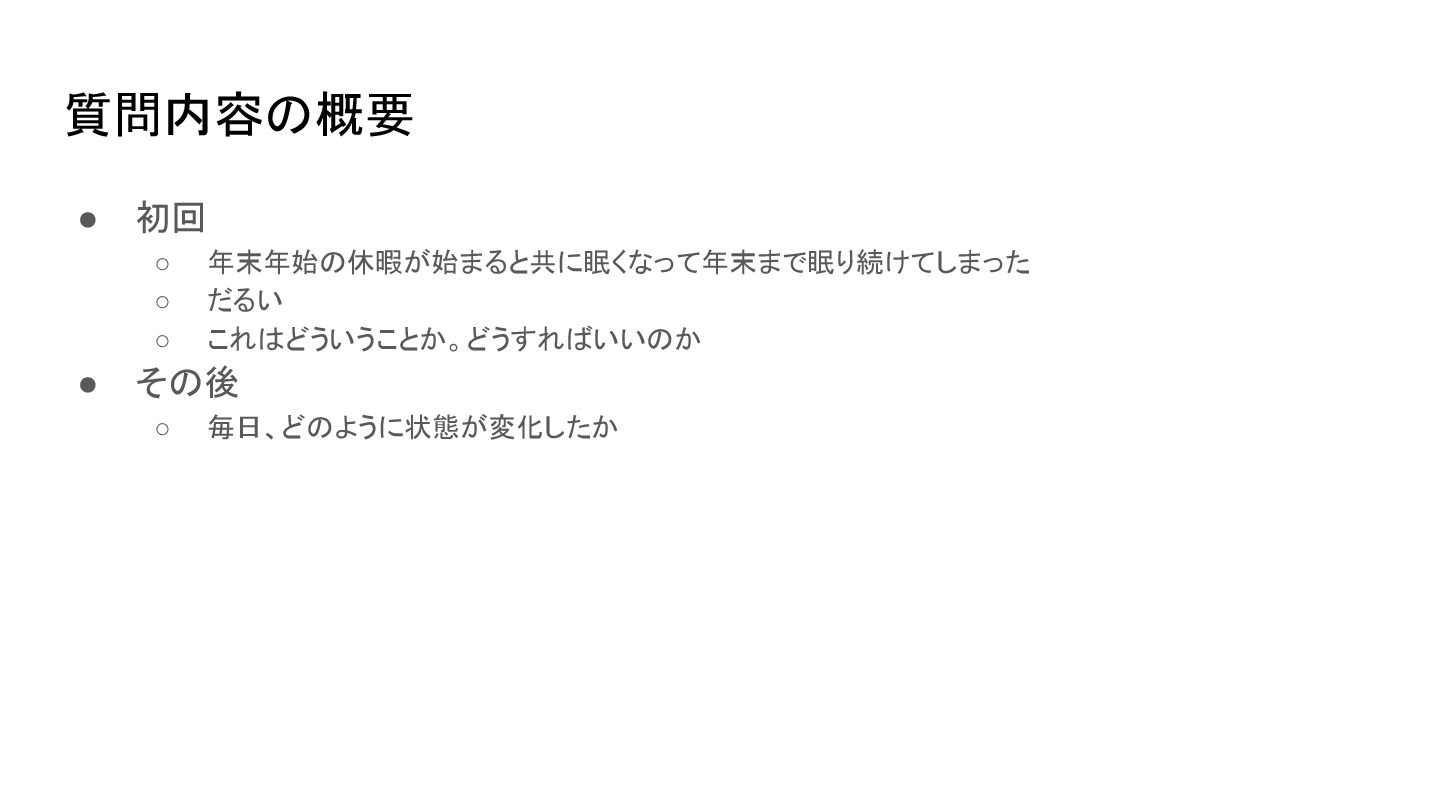 質問内容の概要 • 初回 ◦ 年末年始の休暇が始まると共に眠くなって年末まで眠り続けてしまった ◦ だるい ◦ これはどういうことか。どうすればいいのか •