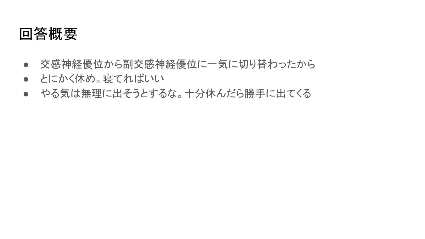 回答概要 • 交感神経優位から副交感神経優位に一気に切り替わったから • とにかく休め。寝てればいい • やる気は無理に出そうとするな。十分休んだら勝手に出てくる