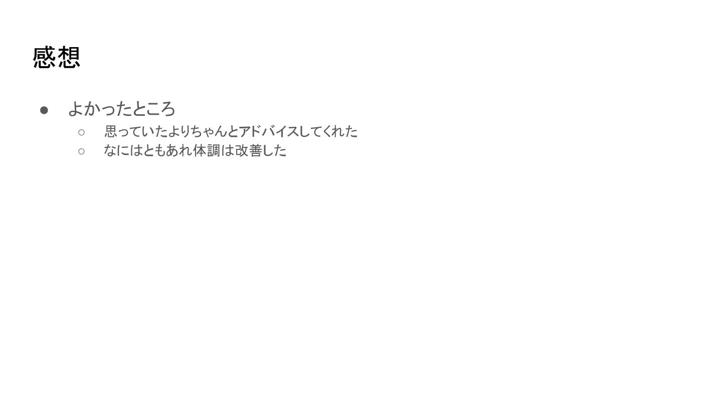 感想 • よかったところ ◦ 思っていたよりちゃんとアドバイスしてくれた ◦ なにはともあれ体調は改善した