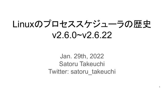 Linuxのプロセススケジューラの歴史 v2.6.0~v2.6.22 Jan. 29th, 2022 Satoru Takeuchi Twitter: satoru_takeuchi 1