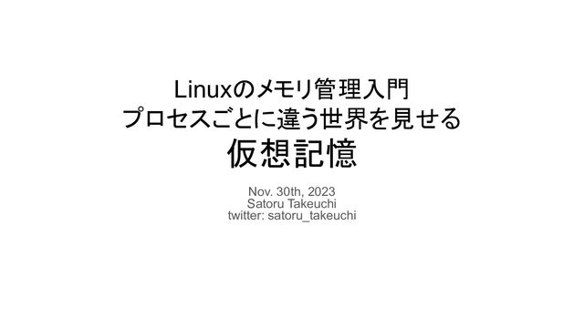 Linuxのメモリ管理入門 プロセスごとに違う世界を見せる 仮想記憶 Nov. 30th, 2023 Satoru Takeuchi twitter: satoru_takeuchi