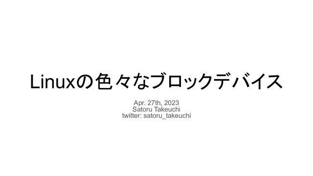 Linuxの色々なブロックデバイス Apr. 27th, 2023 Satoru Takeuchi twitter: satoru_takeuchi
