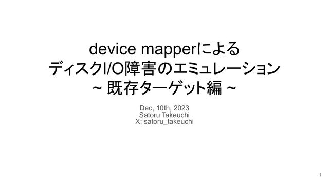 2 2 $ sudo dmsetup create test-flakey test-flakey.txt $ sudo bash -c 'for ((i=0;i<10;i++)) ; do dd if=/dev/mapper/test-flakey of=/dev/null bs=128 count=1 sleep 1 done' ... 128 bytes copied, 0.000198435 s, 645 kB/s dd: error reading '/dev/mapper/test-flakey': Input/output error ... dd: error reading '/dev/mapper/test-flakey': Input/output error ... 128 bytes copied, 0.000169802 s, 754 kB/s ... 128 bytes copied, 0.000224296 s, 571 kB/s dd: error reading '/dev/mapper/test-flakey': Input/output error ... dmデバイスの作成 dmデバイスから1秒に1回read 仕様通りに動作