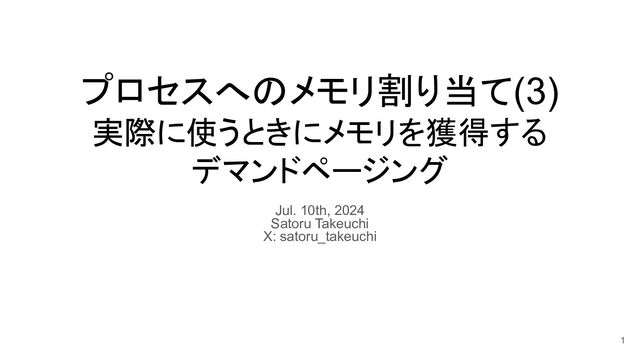 プロセスへのメモリ割り当て(3) 実際に使うときにメモリを獲得する デマンドページング Jul. 10th, 2024 Satoru Takeuchi X: satoru_takeuchi