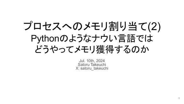 プロセスへのメモリ割り当て(2) Pythonのようなナウい言語では どうやってメモリ獲得するのか Jul. 10th, 2024 Satoru Takeuchi X: satoru_takeuchi