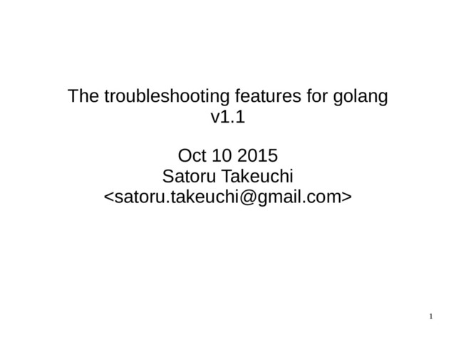 golang • Motivation – There are few documents about the troubleshooting features (e.g. debugger) for golang – The available documents are scattered on the many web pages – I consider it's nice to gather these information in the one place • Software version • Golang: 1.5.1 • OS: fedora22/x86_64