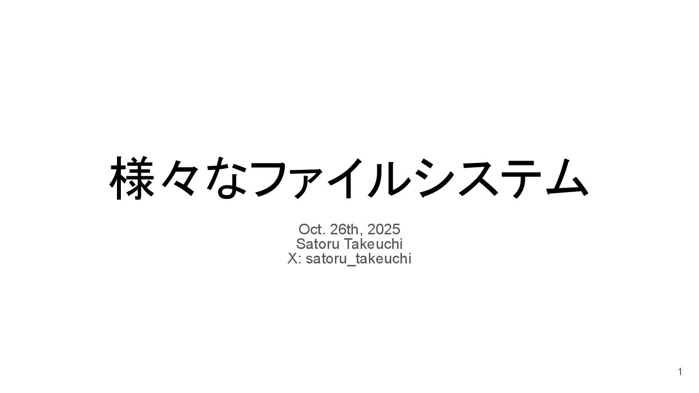 様々なファイルシステム Oct. 26th, 2025 Satoru Takeuchi X: satoru_takeuchi 1