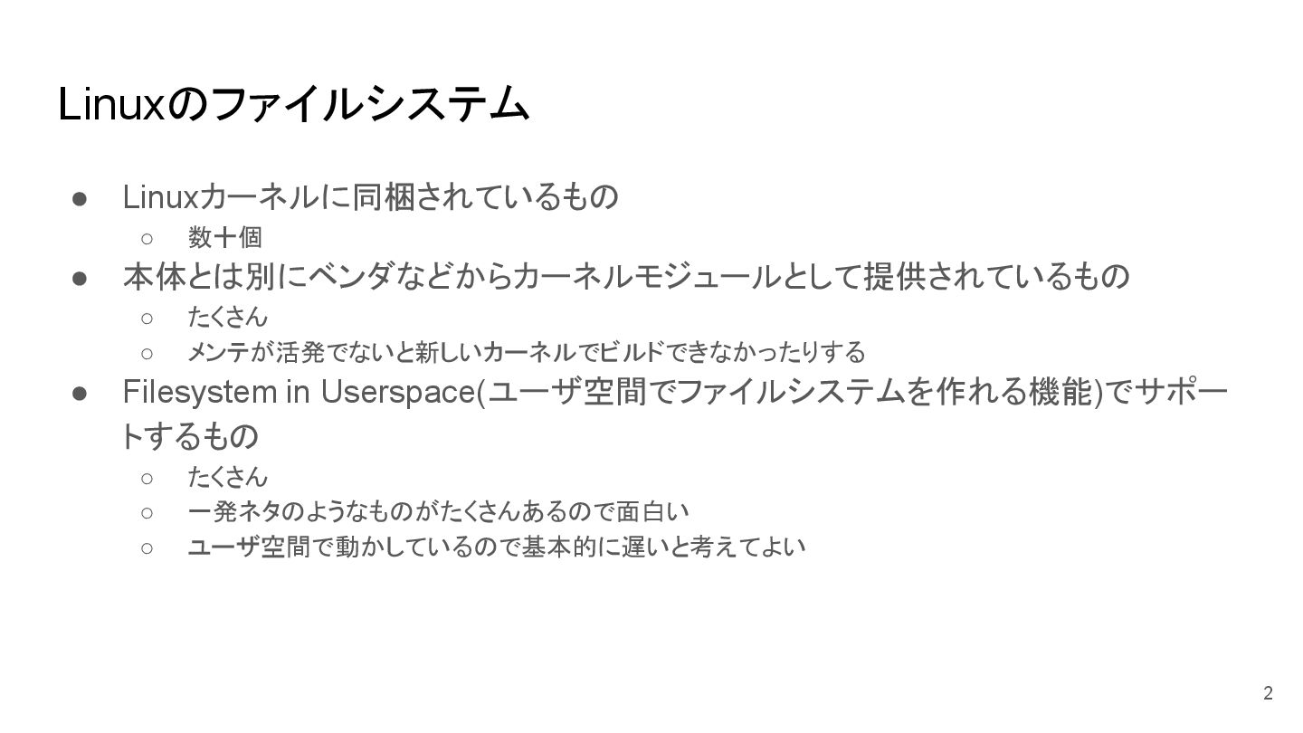 Linuxのファイルシステム • Linuxカーネルに同梱されているもの ◦ 数十個 • 本体とは別にベンダなどからカーネルモジュールとして提供されているもの ◦ たくさん ◦