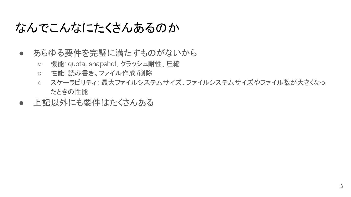 なんでこんなにたくさんあるのか • あらゆる要件を完璧に満たすものがないから ◦ 機能: quota, snapshot, クラッシュ耐性, 圧縮 ◦