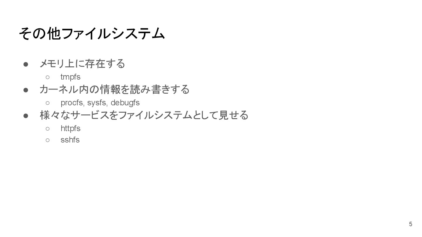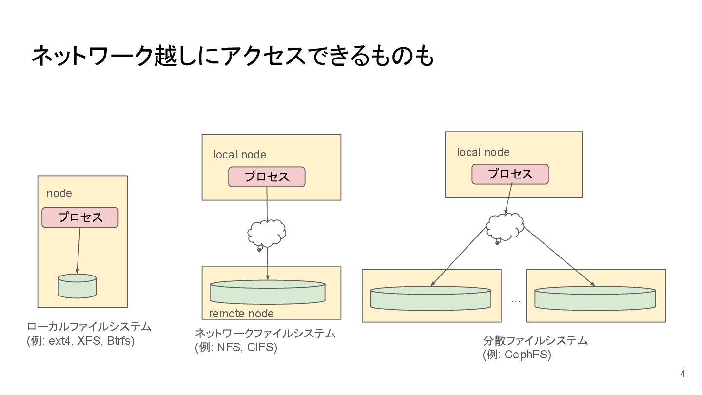 ネットワーク越しにアクセスできるものも 4 ローカルファイルシステム (例: ext4, XFS, Btrfs) ネットワークファイルシステム (例: NFS,