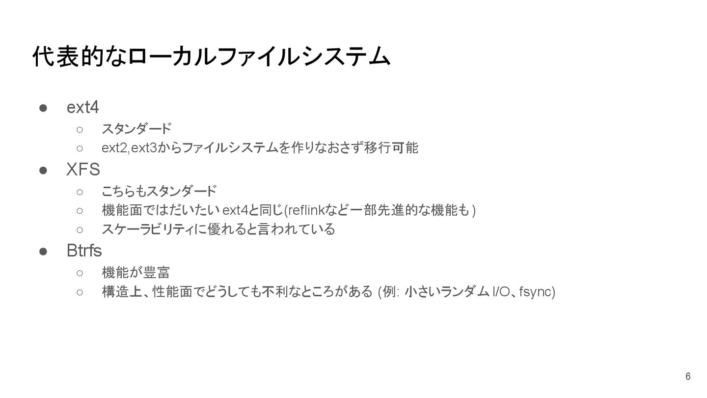 こちらもスタンダード ◦ 機能面ではだいたい ext4と同じ(reflinkなど一部先進的な機能も ) ◦ スケーラビリティに優れると言われている • Btrfs ◦ 機能が豊富 ◦ 構造上、性能面でどうしても不利なところがある (例: 小さいランダムI/O、fsync) 6