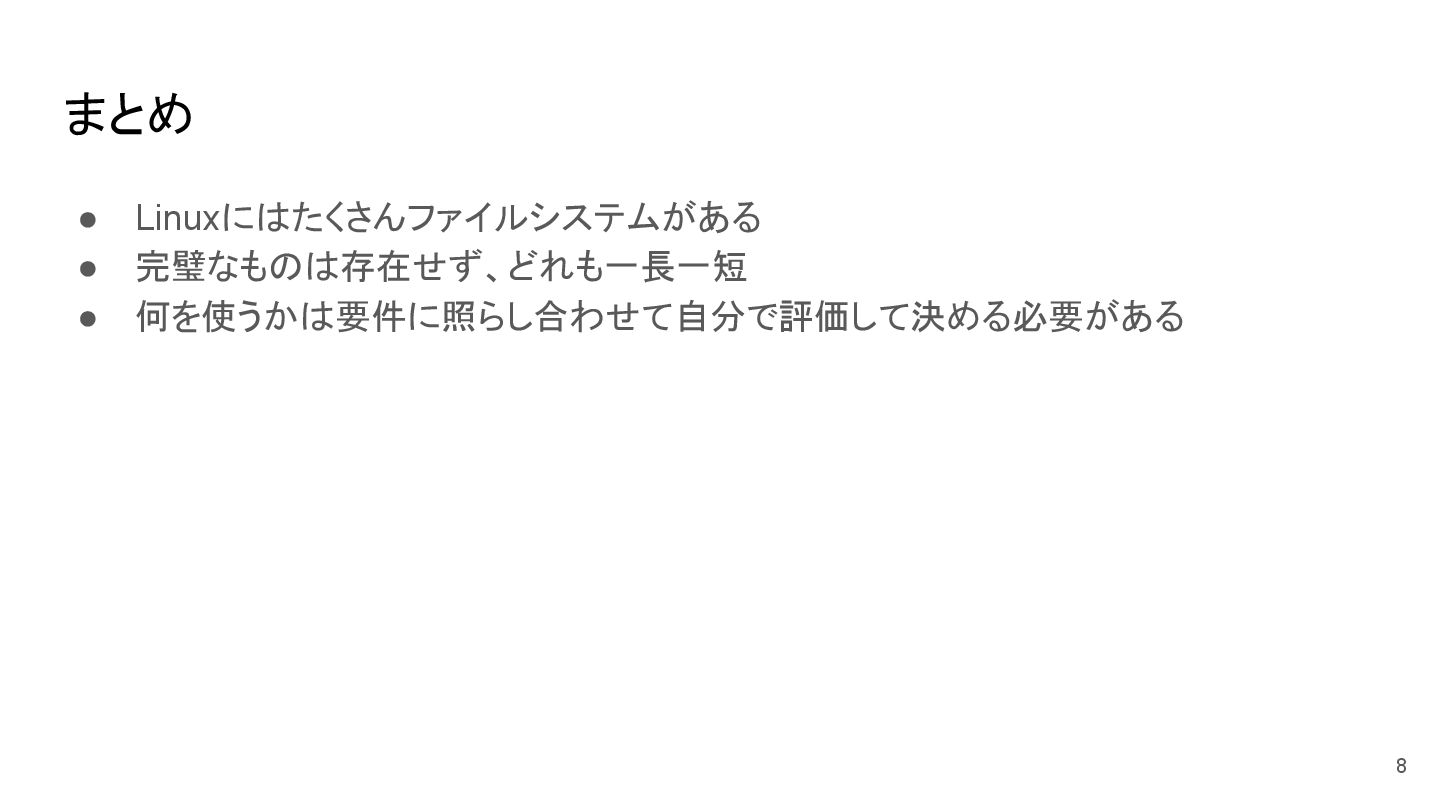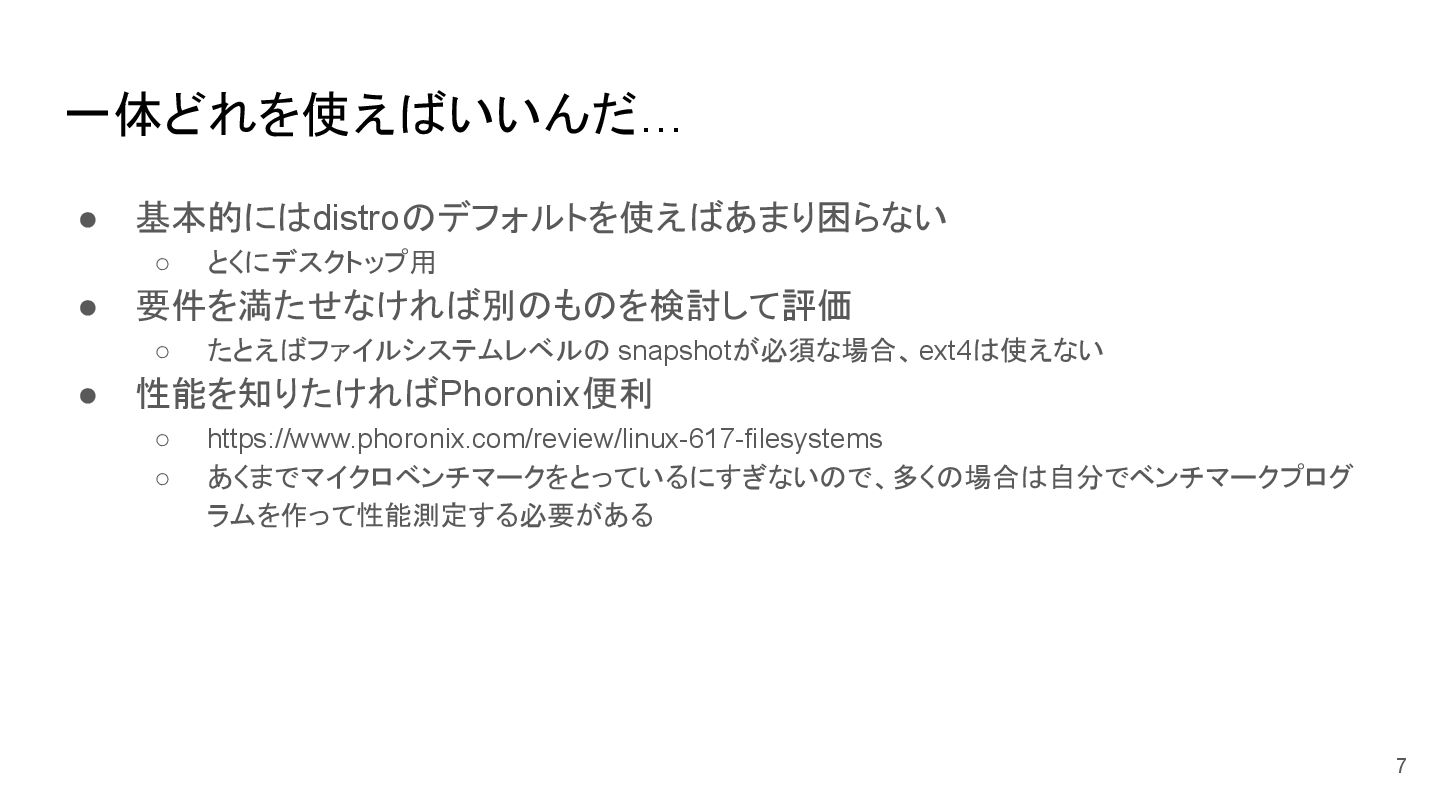 • 性能を知りたければPhoronix便利 ◦ https://www.phoronix.com/review/linux-617-filesystems ◦ あくまでマイクロベンチマークをとっているにすぎないので、多くの場合は自分でベンチマークプログ ラムを作って性能測定する必要がある 7