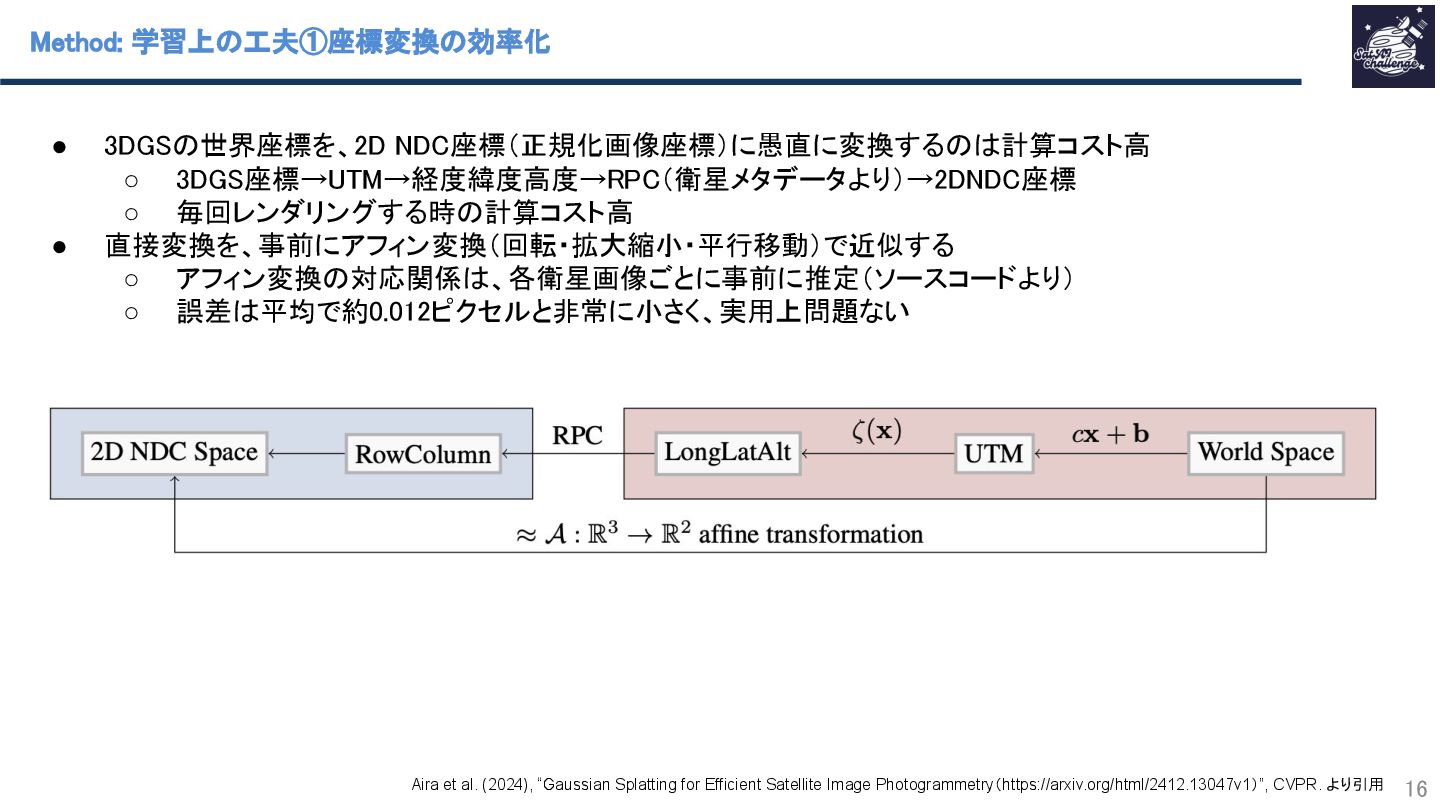 NVSの新手法である3DGSを用いることで、大幅な計算量削減が可能であり、3DGSによってDSMを作成するため、Gaussianの位置を元に地表面位置を推定する枠組みを構築し、①効率的な座標変換②シャドウマッピング③正則化によって、NeRF並に高精度でありながら、学習時間は300分の1に抑えたDSM作成を実現しました。