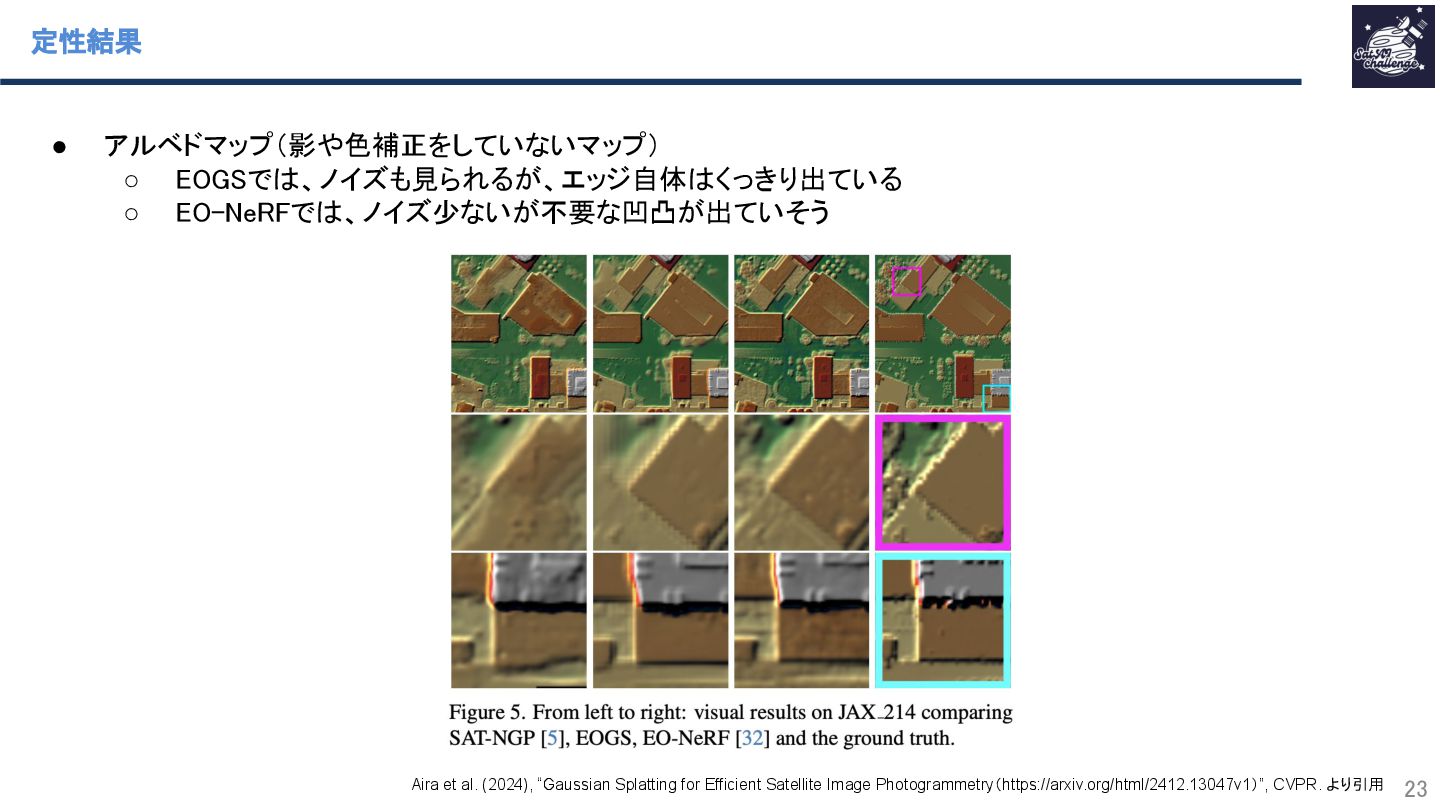 紹介する論文は、「EOGS: Gaussian Splatting for Efficient Satellite Image Photogrammetry」です。この研究では、衛星画像によるDSM(地表面高さのモデル)作成に、初めて3D Gaussian Splatting(3DGS)を適用しています。非同時撮影の複数衛星画像を用いたDSM作成では、新規視点合成(NVS)手法のNeRFなどが用いられてきましたが、計算量の多さがネックになっていました。