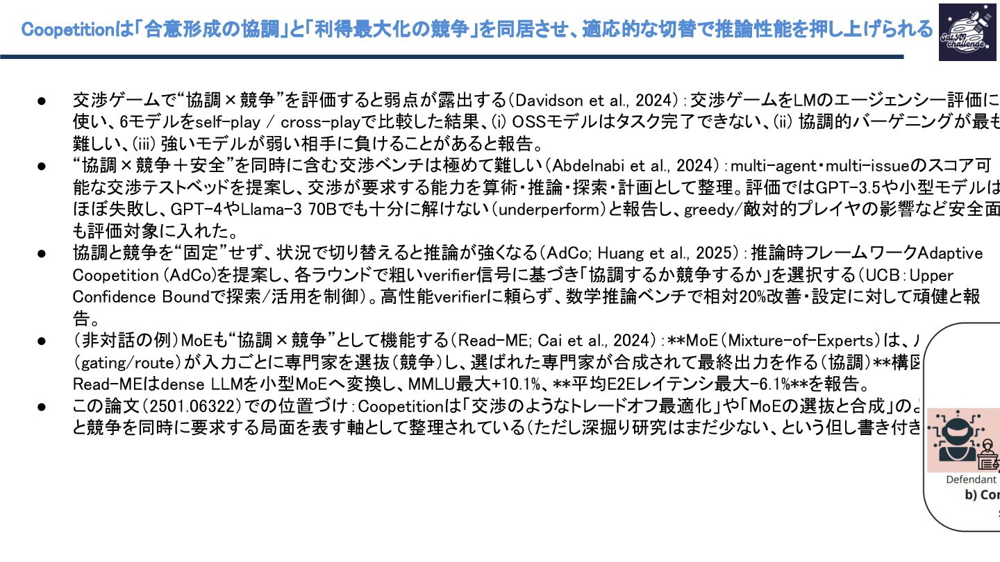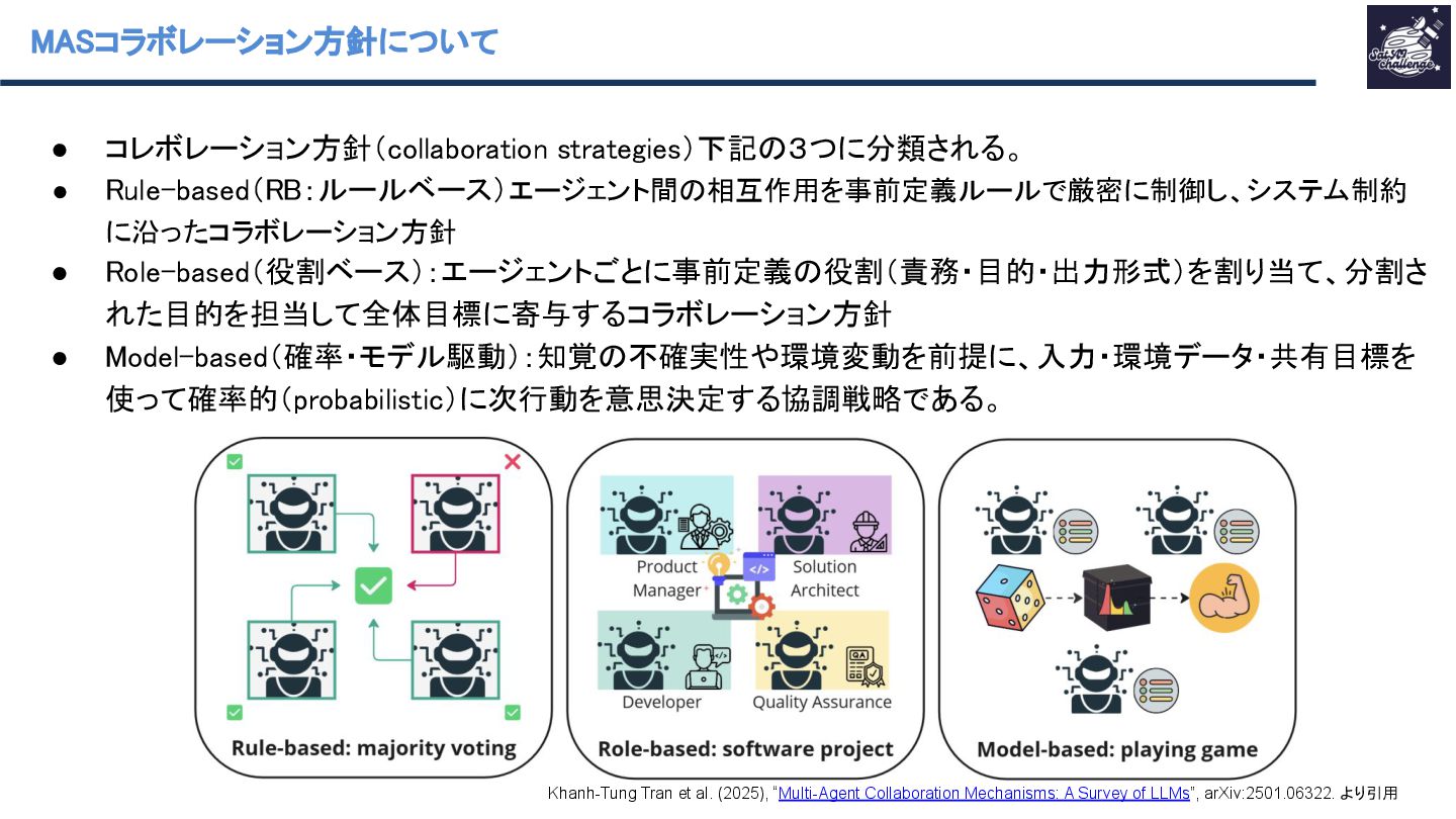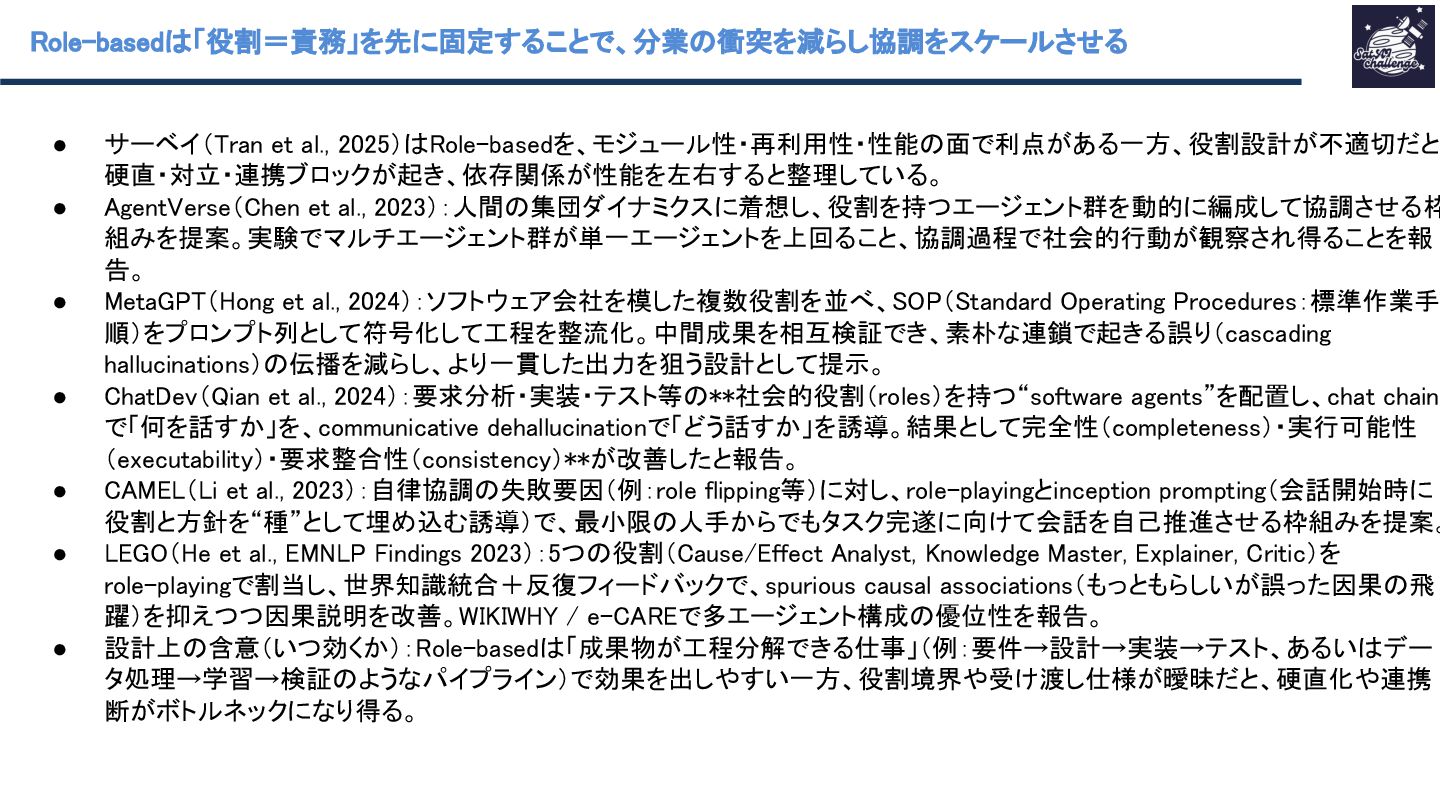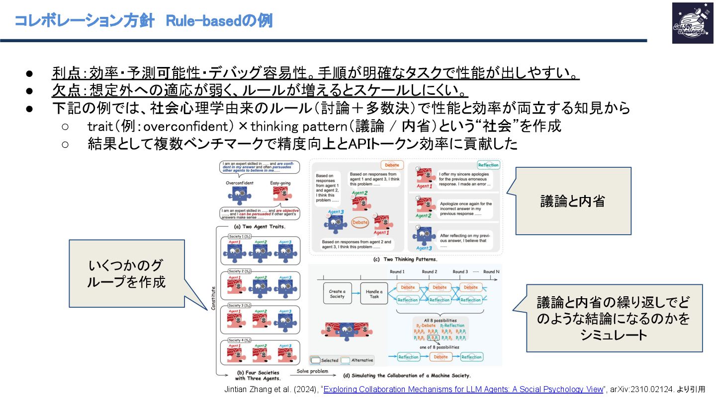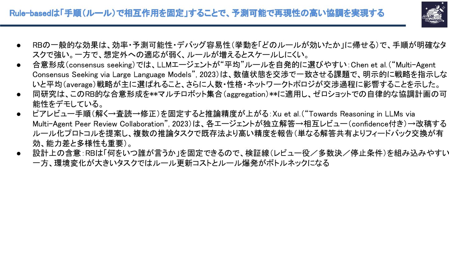 al.(“Multi-Agent Consensus Seeking via Large Language Models”, 2023)は、数値状態を交渉で一致させる課題で、明示的に戦略を指示しな いと平均(average)戦略が主に選ばれること、さらに人数・性格・ネットワークトポロジが交渉過程に影響することを示した。 • 同研究は、このRB的な合意形成を**マルチロボット集合(aggregation)**に適用し、ゼロショットでの自律的な協調計画の可 能性をデモしている。 • ピアレビュー手順(解く→査読→修正)を固定すると推論精度が上がる:Xu et al.(“Towards Reasoning in LLMs via Multi-Agent Peer Review Collaboration”, 2023)は、各エージェントが独立解答→相互レビュー(confidence付き)→改稿する ルール化プロトコルを提案し、複数の推論タスクで既存法より高い精度を報告(単なる解答共有よりフィードバック交換が有 効、能力差と多様性も重要)。 • 設計上の含意:RBは「何をいつ誰が言うか」を固定できるので、検証線(レビュー役/多数決/停止条件)を組み込みやすい 一方、環境変化が大きいタスクではルール更新コストとルール爆発がボトルネックになる
