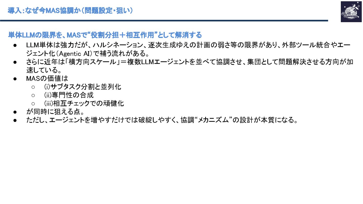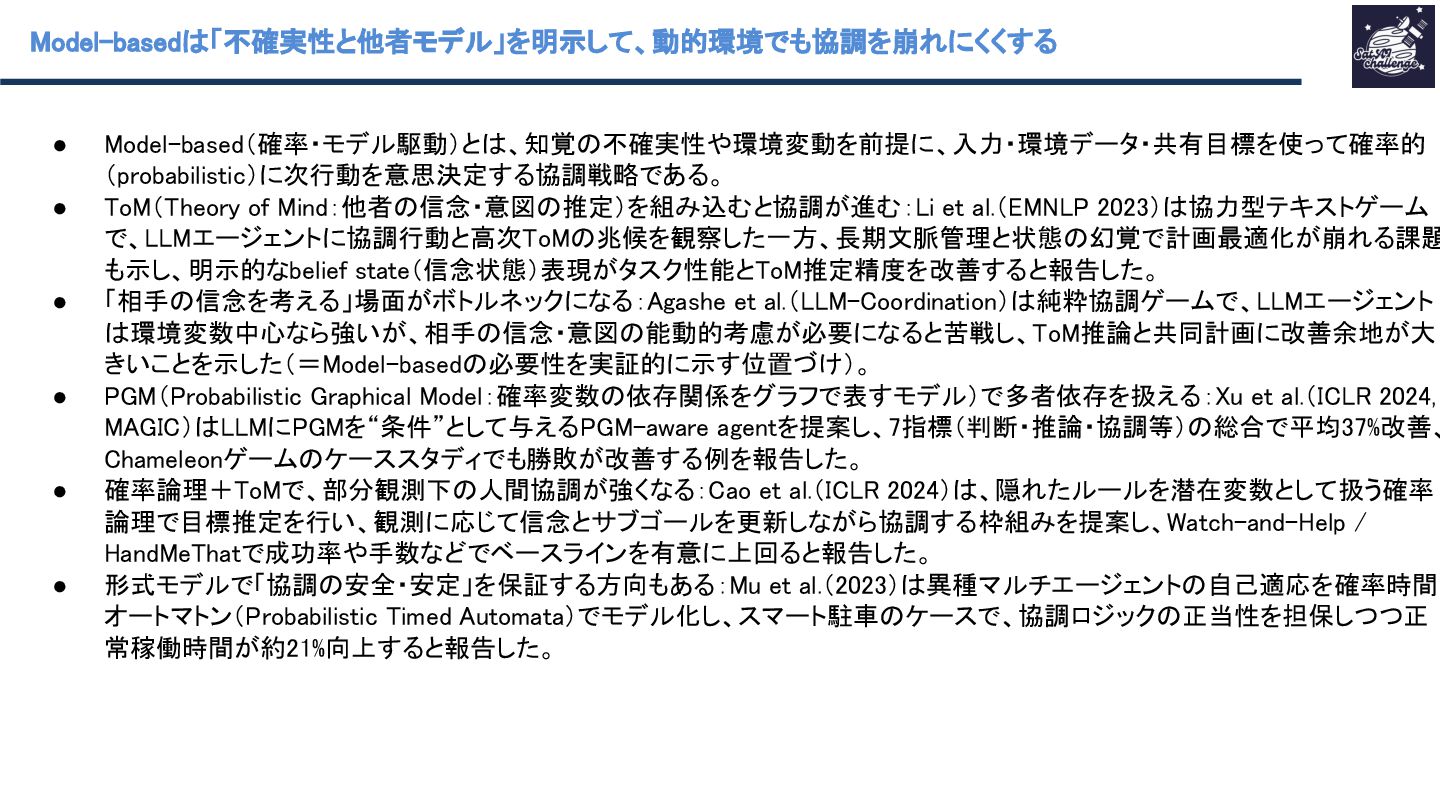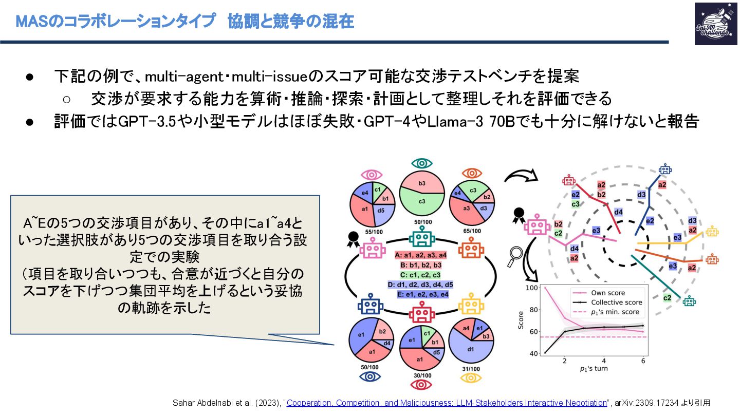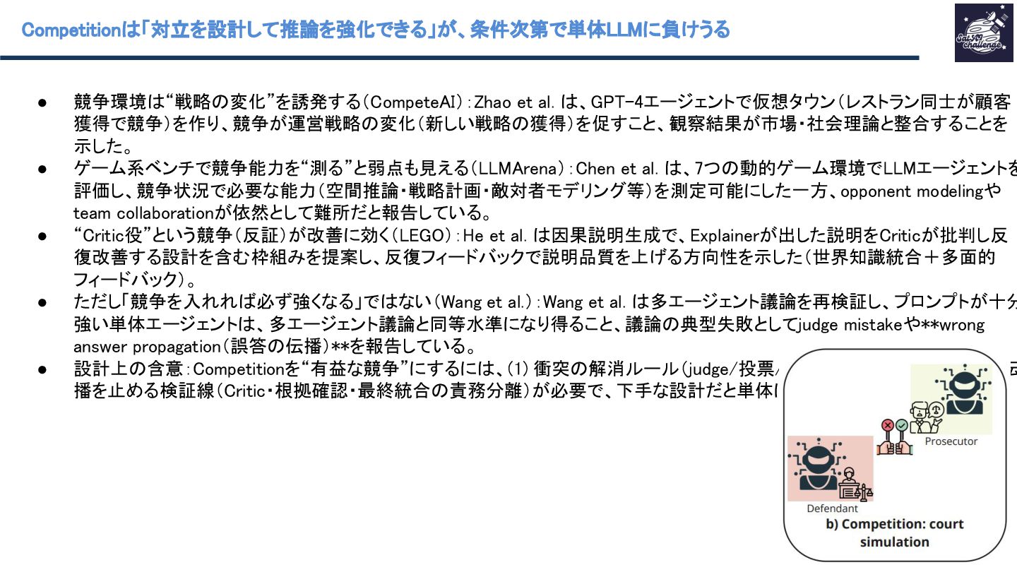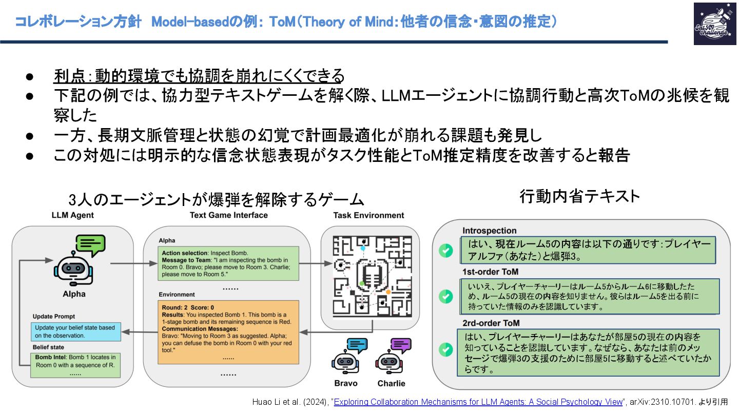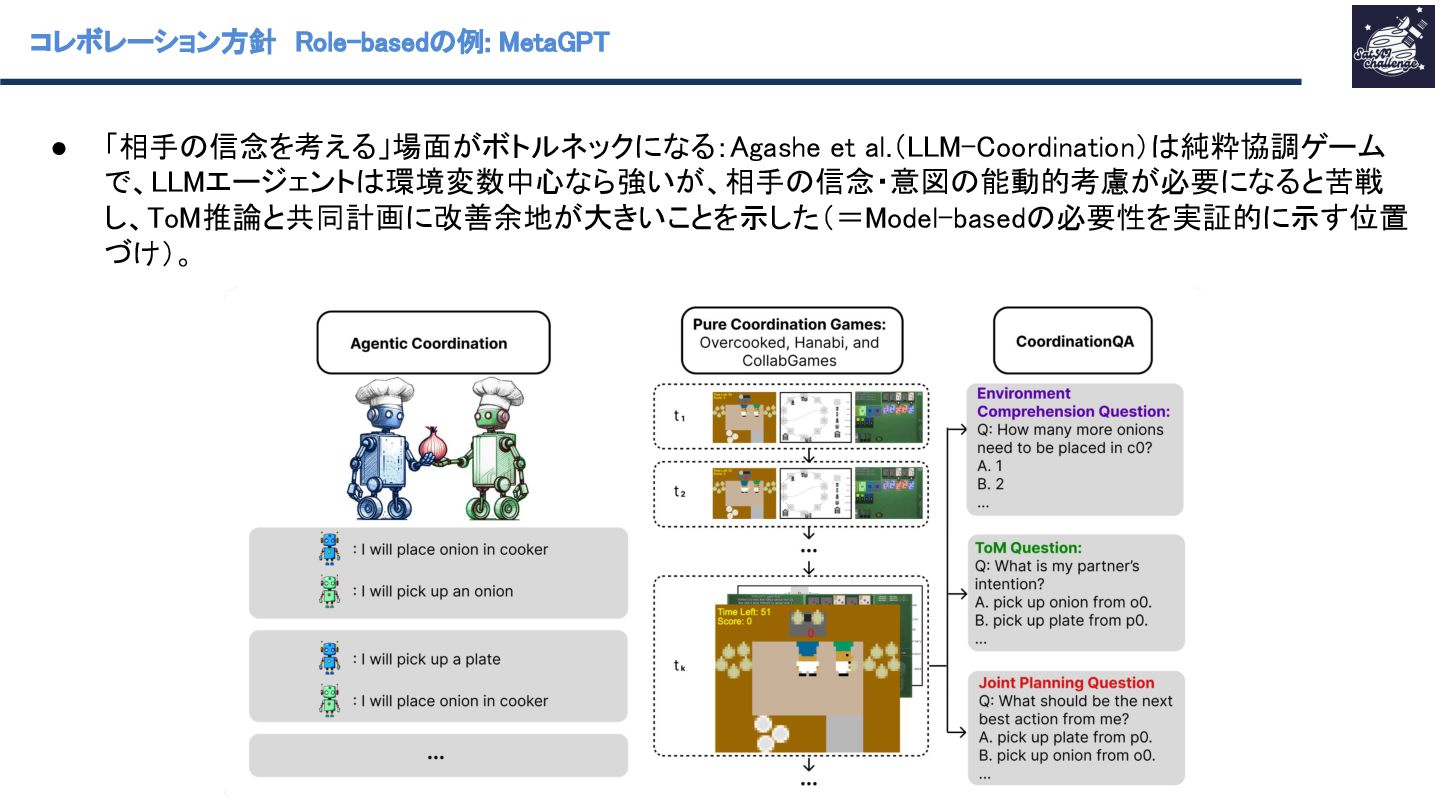 al.(“Multi-Agent Consensus Seeking via Large Language Models”, 2023)は、数値状態を交渉で一致させる課題で、明示的に戦略を指示しな いと平均(average)戦略が主に選ばれること、さらに人数・性格・ネットワークトポロジが交渉過程に影響することを示した。 • 同研究は、このRB的な合意形成を**マルチロボット集合(aggregation)**に適用し、ゼロショットでの自律的な協調計画の可 能性をデモしている。 • ピアレビュー手順(解く→査読→修正)を固定すると推論精度が上がる:Xu et al.(“Towards Reasoning in LLMs via Multi-Agent Peer Review Collaboration”, 2023)は、各エージェントが独立解答→相互レビュー(confidence付き)→改稿する ルール化プロトコルを提案し、複数の推論タスクで既存法より高い精度を報告(単なる解答共有よりフィードバック交換が有 効、能力差と多様性も重要)。 • 設計上の含意:RBは「何をいつ誰が言うか」を固定できるので、検証線(レビュー役/多数決/停止条件)を組み込みやすい 一方、環境変化が大きいタスクではルール更新コストとルール爆発がボトルネックになる