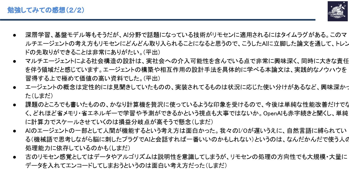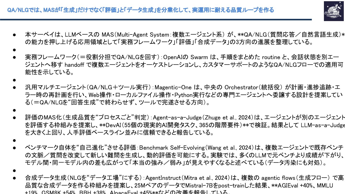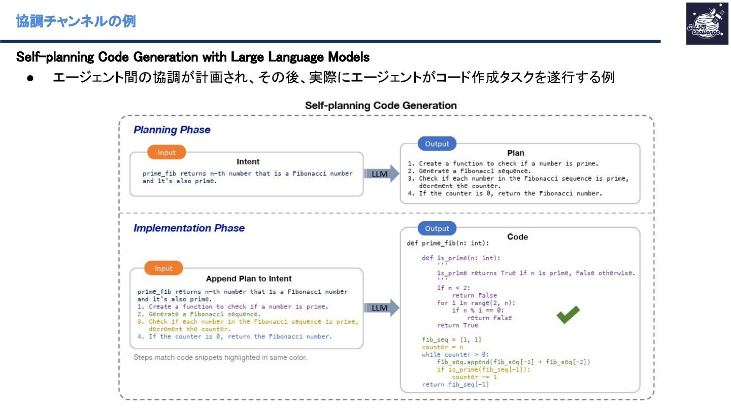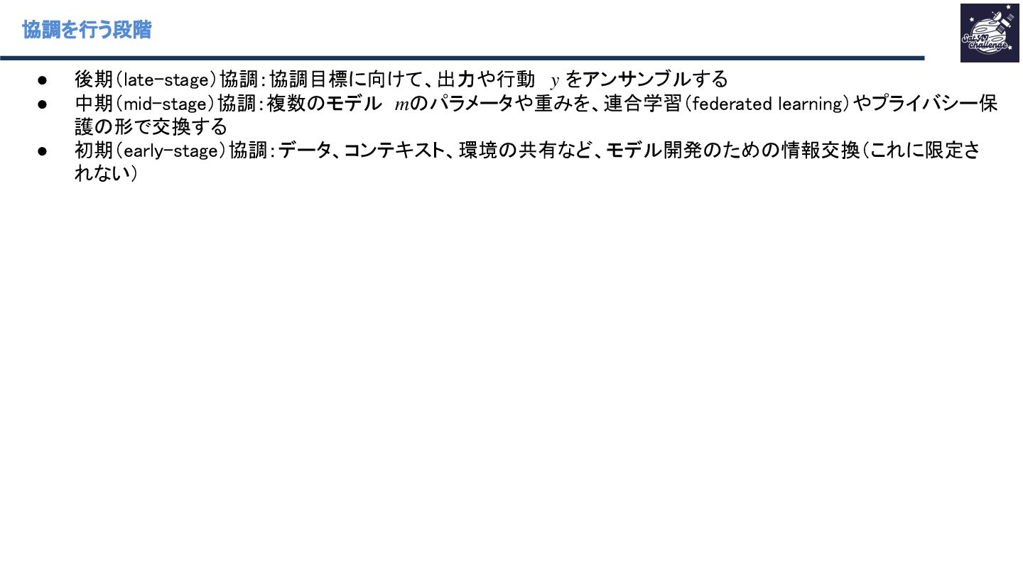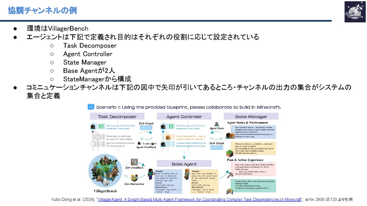 al.(“Multi-Agent Consensus Seeking via Large Language Models”, 2023)は、数値状態を交渉で一致させる課題で、明示的に戦略を指示しな いと平均(average)戦略が主に選ばれること、さらに人数・性格・ネットワークトポロジが交渉過程に影響することを示した。 • 同研究は、このRB的な合意形成を**マルチロボット集合(aggregation)**に適用し、ゼロショットでの自律的な協調計画の可 能性をデモしている。 • ピアレビュー手順(解く→査読→修正)を固定すると推論精度が上がる:Xu et al.(“Towards Reasoning in LLMs via Multi-Agent Peer Review Collaboration”, 2023)は、各エージェントが独立解答→相互レビュー(confidence付き)→改稿する ルール化プロトコルを提案し、複数の推論タスクで既存法より高い精度を報告(単なる解答共有よりフィードバック交換が有 効、能力差と多様性も重要)。 • 設計上の含意:RBは「何をいつ誰が言うか」を固定できるので、検証線(レビュー役/多数決/停止条件)を組み込みやすい 一方、環境変化が大きいタスクではルール更新コストとルール爆発がボトルネックになる