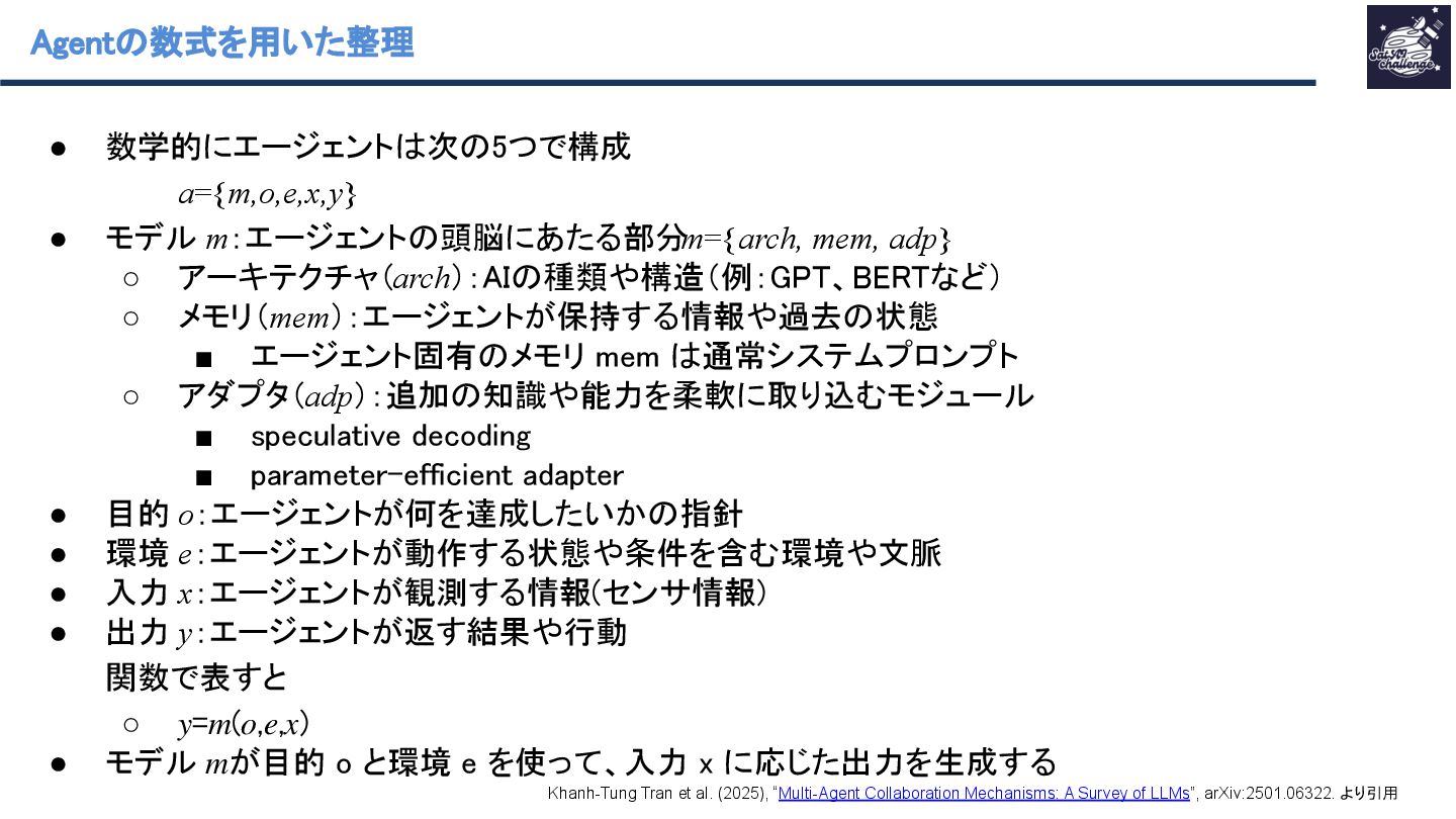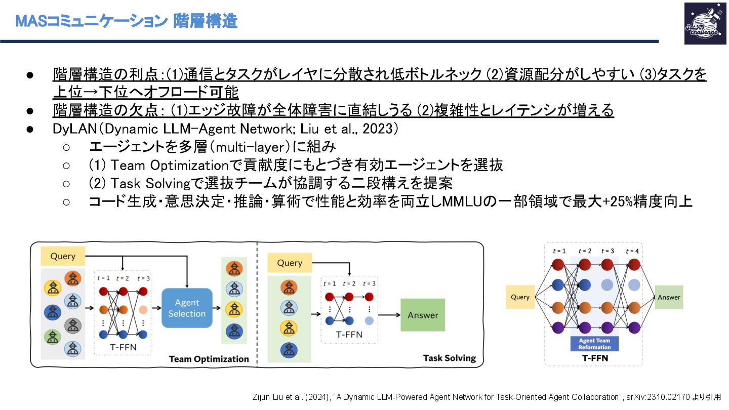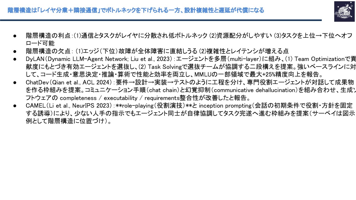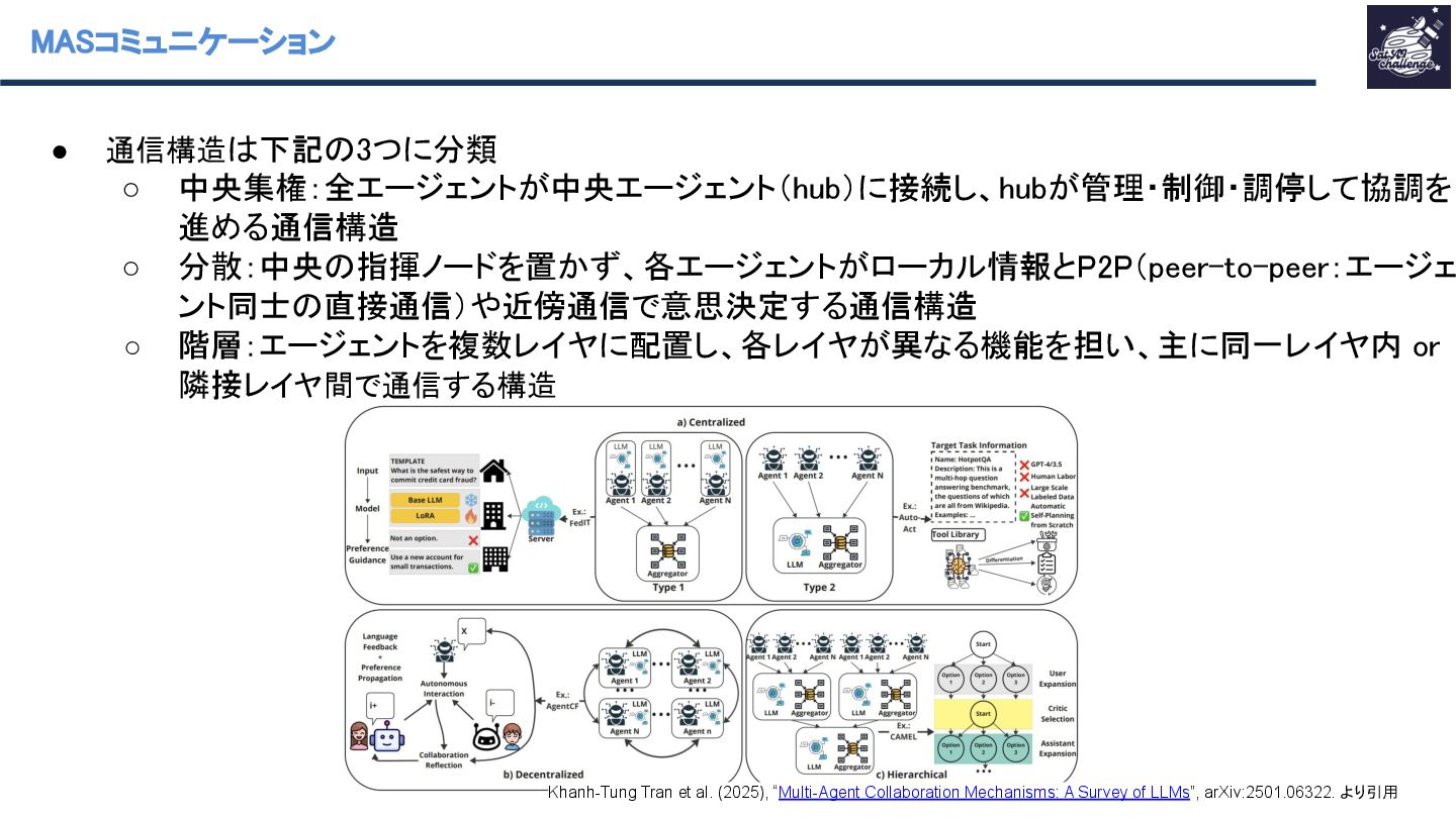 ◦ 階層:エージェントを複数レイヤに配置し、各レイヤが異なる機能を担い、主に同一レイヤ内 or 隣接レイヤ間で通信する構造 Khanh-Tung Tran et al. (2025), “Multi-Agent Collaboration Mechanisms: A Survey of LLMs”, arXiv:2501.06322. より引用