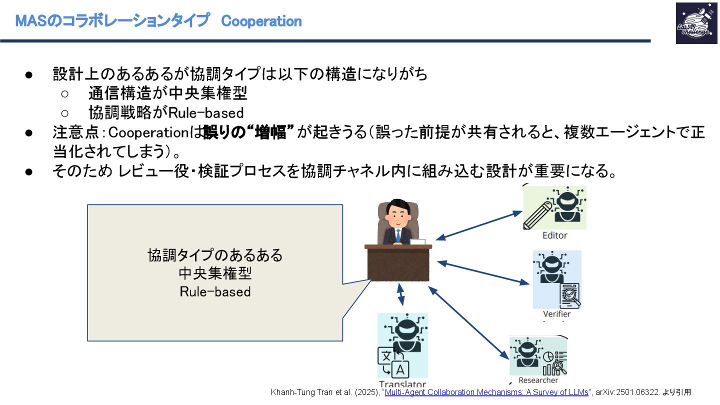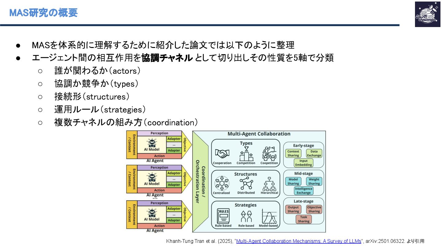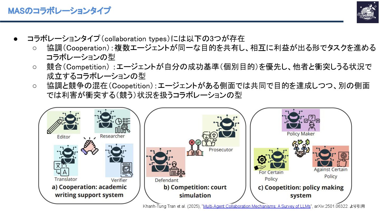 ◦ 階層:エージェントを複数レイヤに配置し、各レイヤが異なる機能を担い、主に同一レイヤ内 or 隣接レイヤ間で通信する構造 Khanh-Tung Tran et al. (2025), “Multi-Agent Collaboration Mechanisms: A Survey of LLMs”, arXiv:2501.06322. より引用