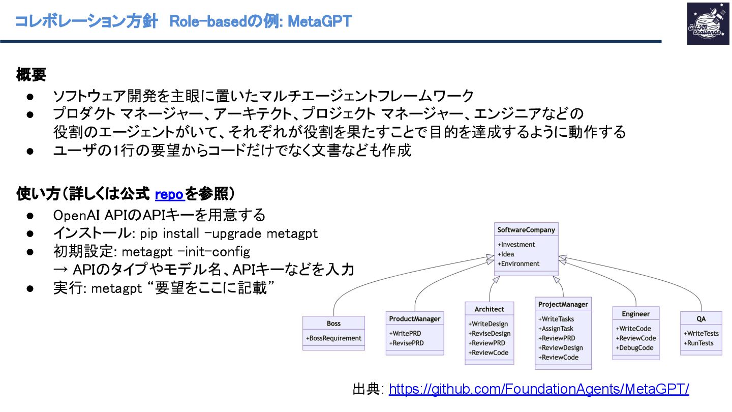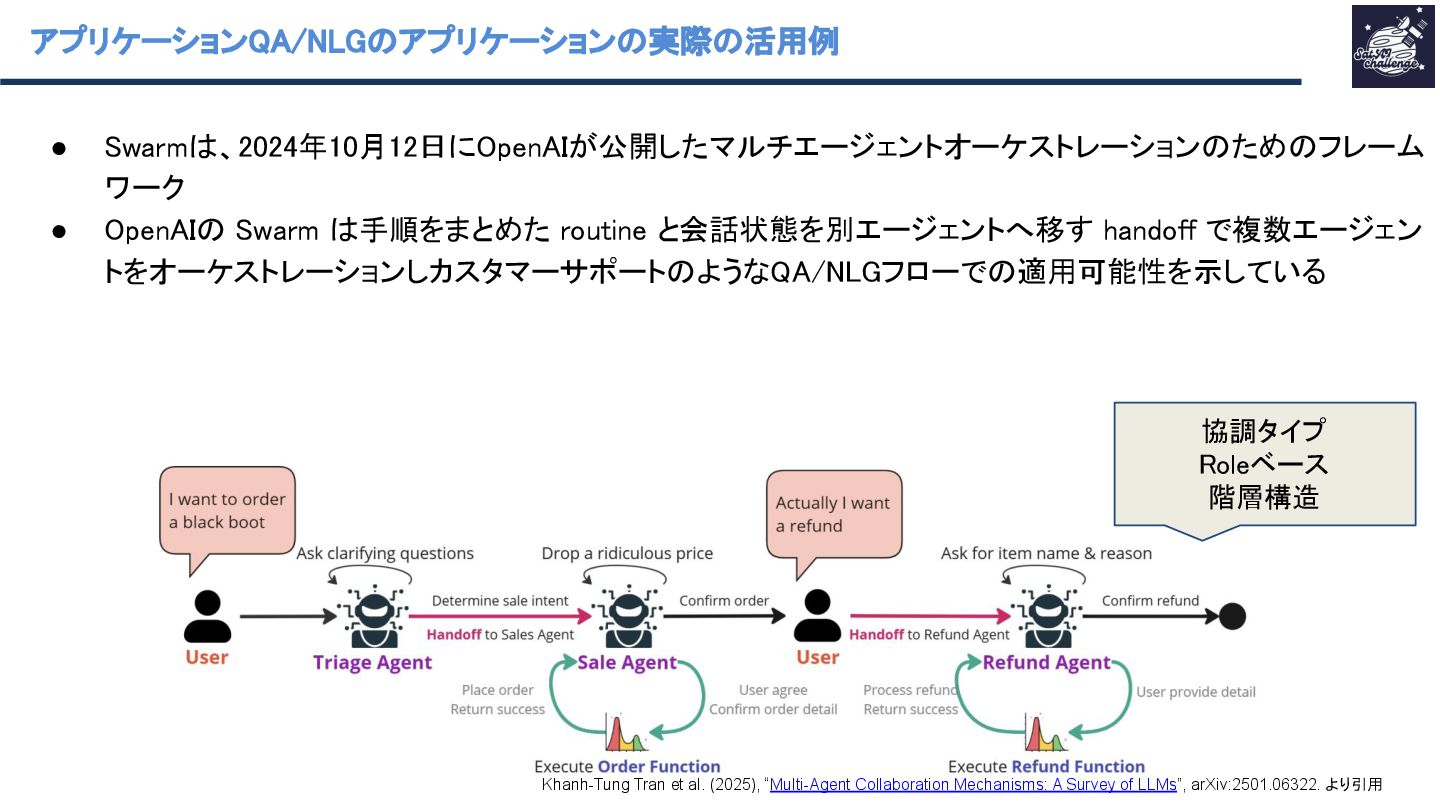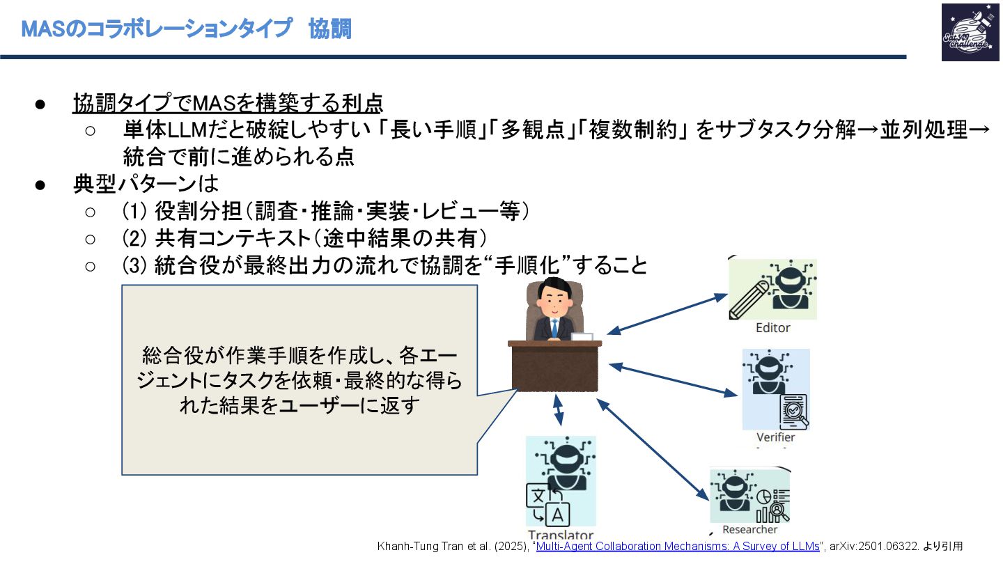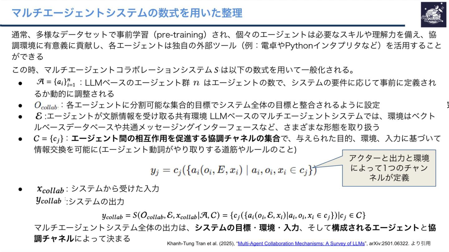 ◦ 階層:エージェントを複数レイヤに配置し、各レイヤが異なる機能を担い、主に同一レイヤ内 or 隣接レイヤ間で通信する構造 Khanh-Tung Tran et al. (2025), “Multi-Agent Collaboration Mechanisms: A Survey of LLMs”, arXiv:2501.06322. より引用