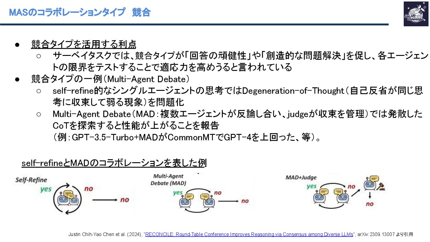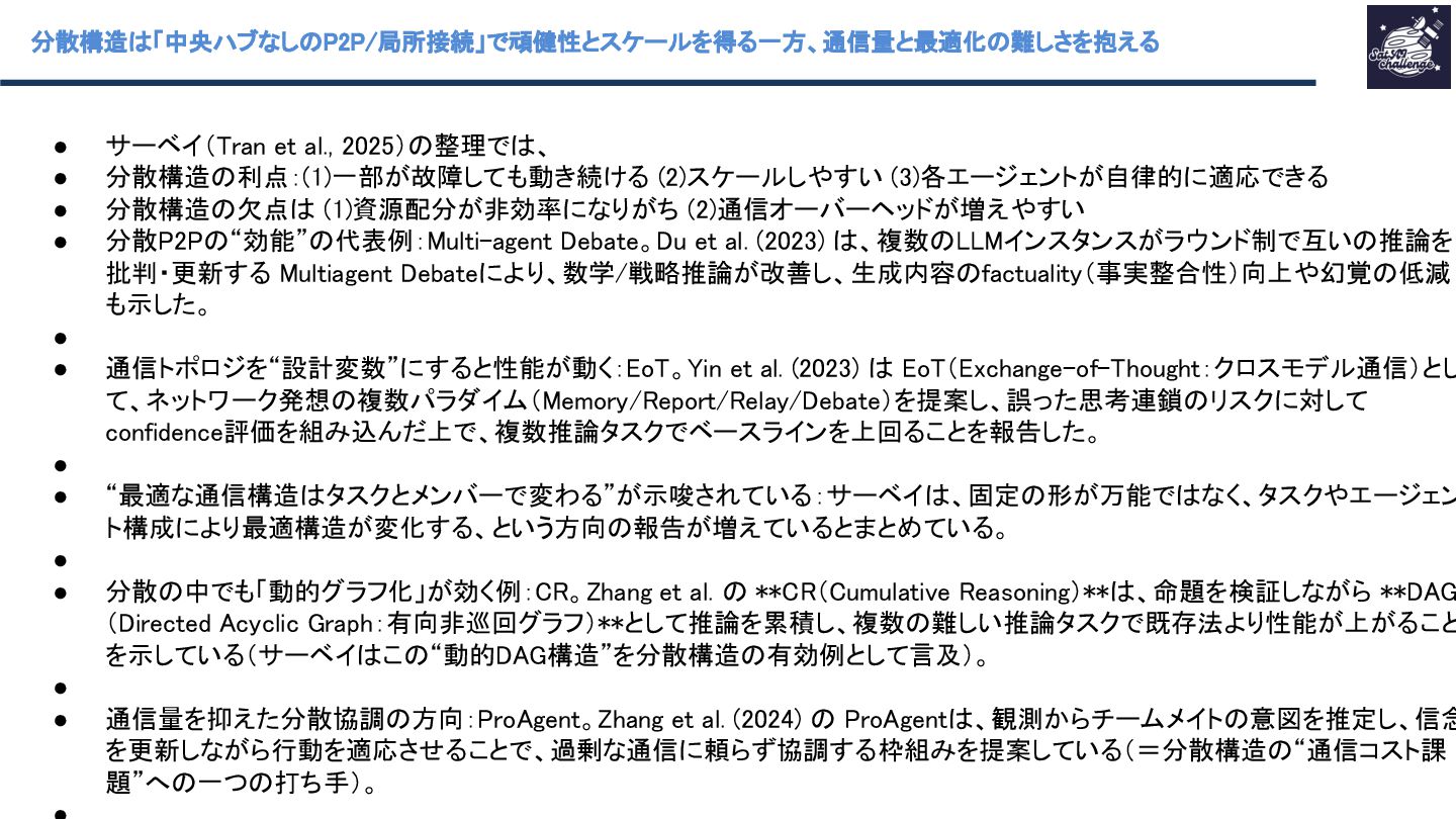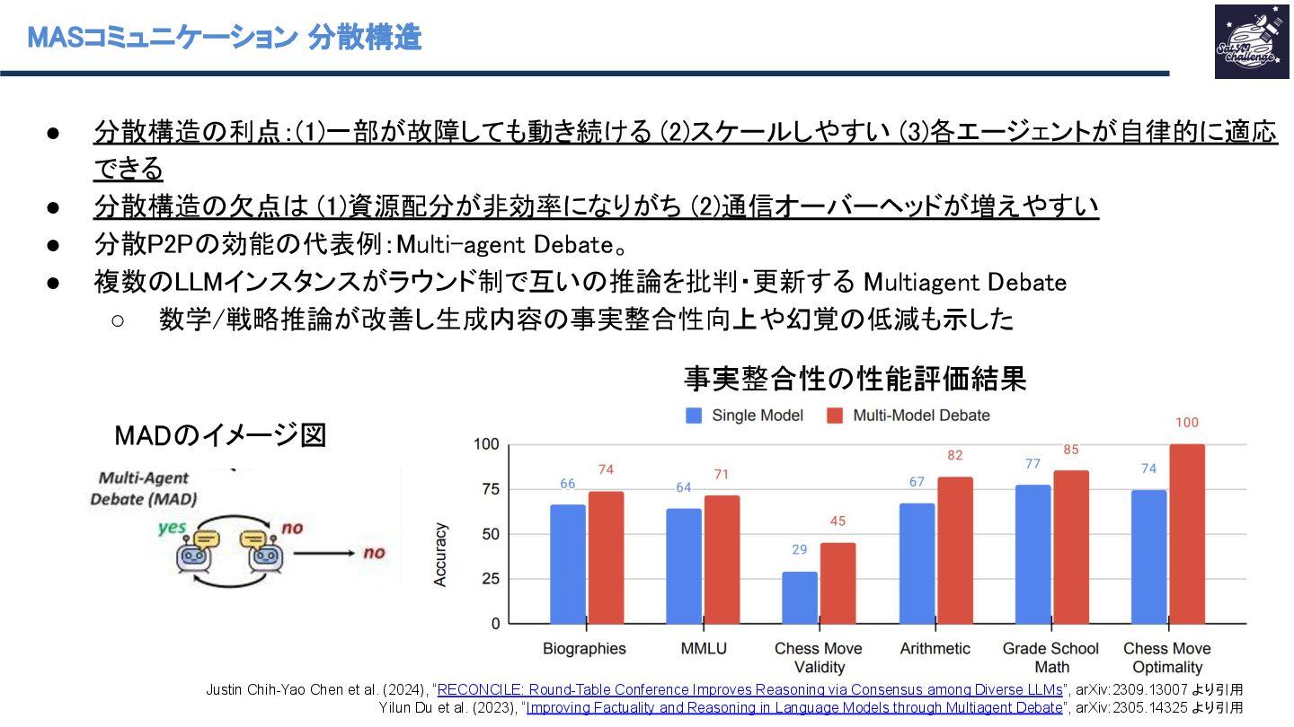 (1)資源配分が非効率になりがち (2)通信オーバーヘッドが増えやすい • 分散P2Pの効能の代表例:Multi-agent Debate。 • 複数のLLMインスタンスがラウンド制で互いの推論を批判・更新する Multiagent Debate ◦ 数学/戦略推論が改善し生成内容の事実整合性向上や幻覚の低減も示した Justin Chih-Yao Chen et al. (2024), “RECONCILE: Round-Table Conference Improves Reasoning via Consensus among Diverse LLMs”, arXiv:2309.13007 より引用 Yilun Du et al. (2023), “Improving Factuality and Reasoning in Language Models through Multiagent Debate”, arXiv:2305.14325 より引用 MADのイメージ図 事実整合性の性能評価結果