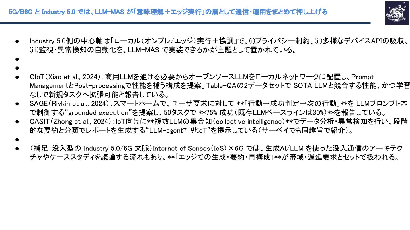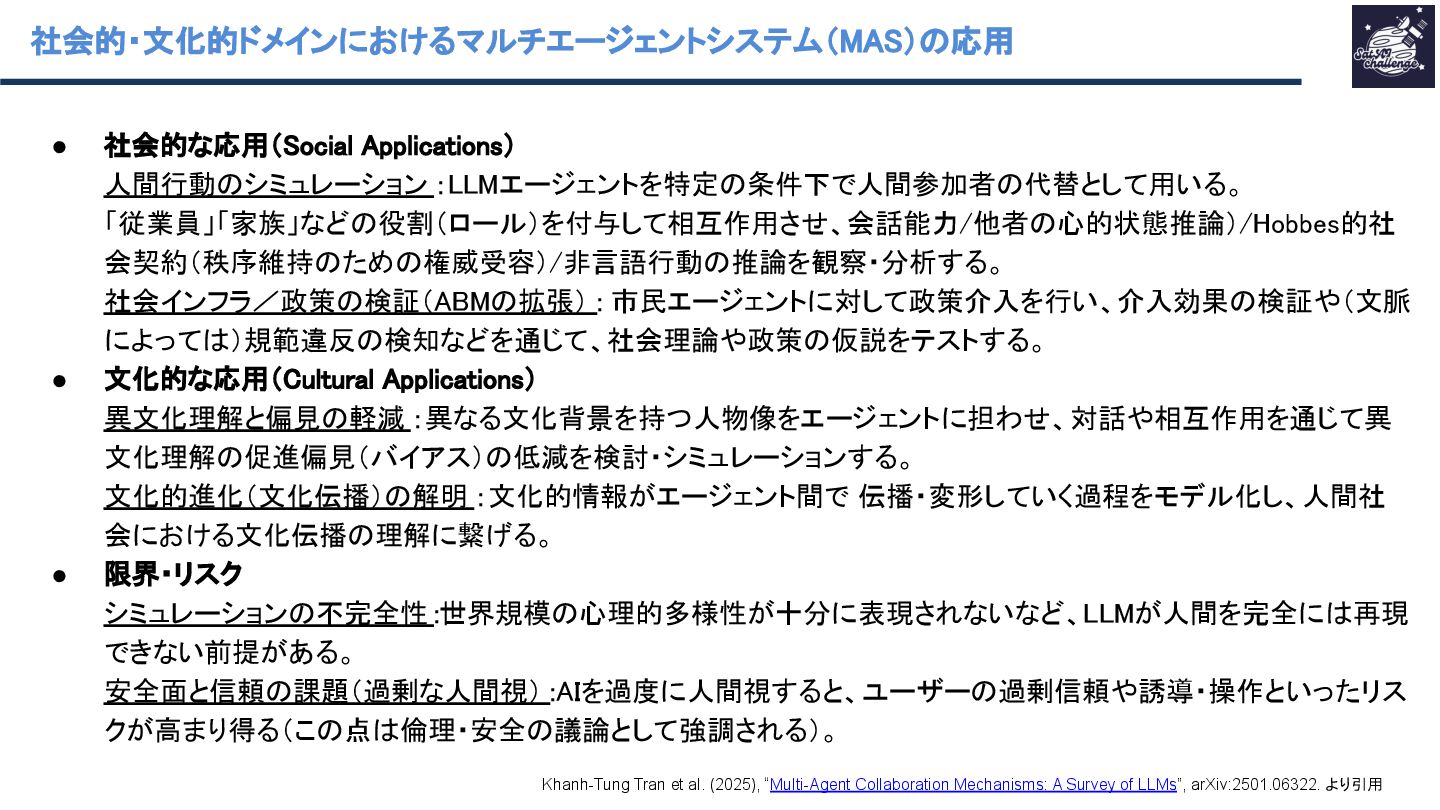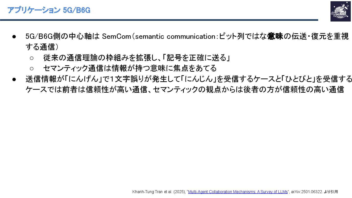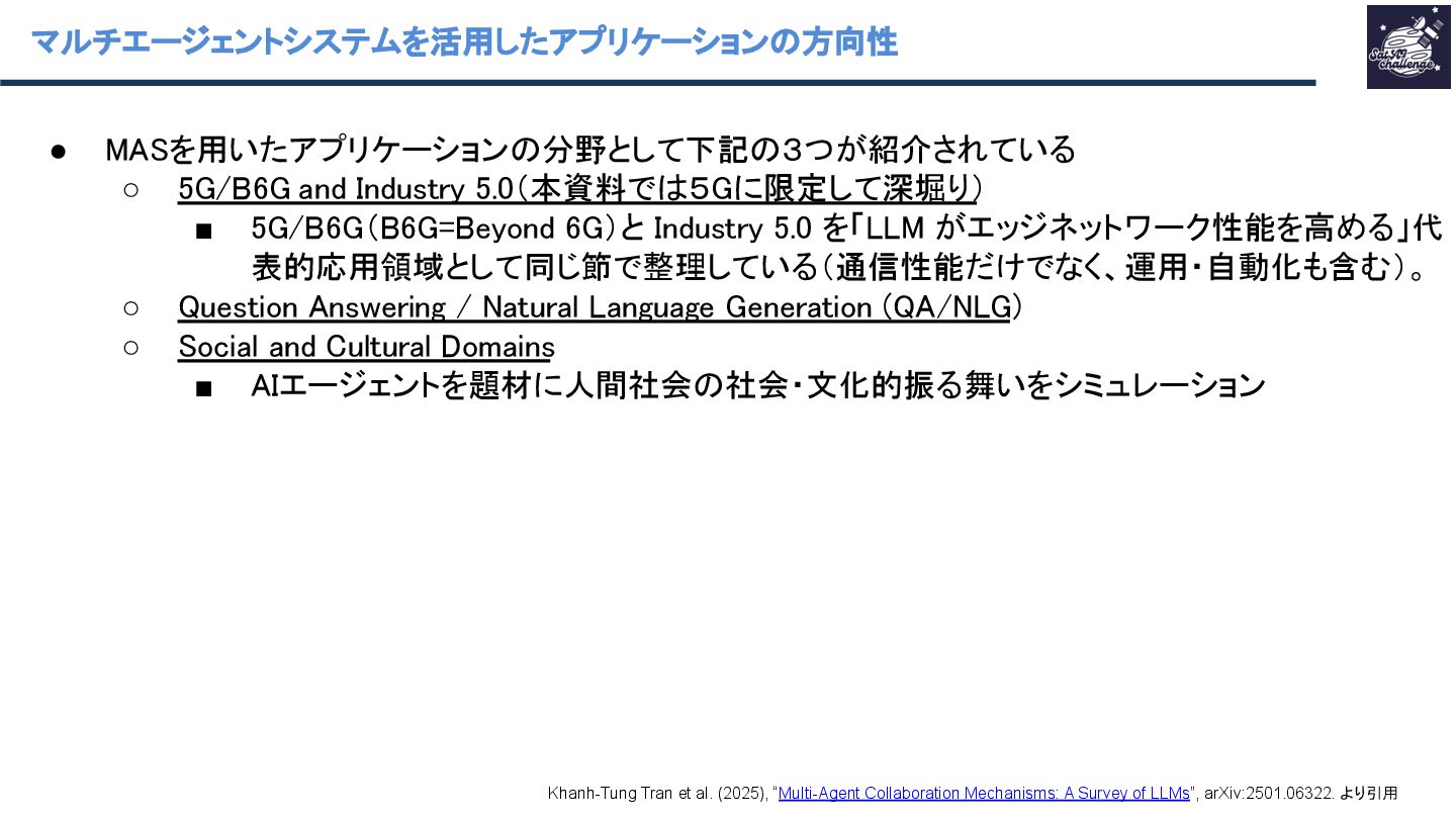 ▪ 5G/B6G(B6G=Beyond 6G)と Industry 5.0 を「LLM がエッジネットワーク性能を高める」代 表的応用領域として同じ節で整理している(通信性能だけでなく、運用・自動化も含む)。 ◦ Question Answering / Natural Language Generation (QA/NLG) ◦ Social and Cultural Domains ▪ AIエージェントを題材に人間社会の社会・文化的振る舞いをシミュレーション Khanh-Tung Tran et al. (2025), “Multi-Agent Collaboration Mechanisms: A Survey of LLMs”, arXiv:2501.06322. より引用