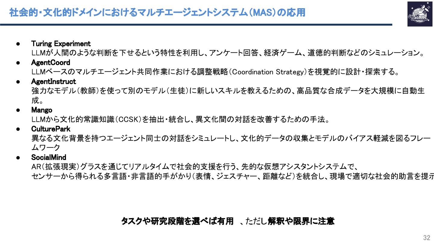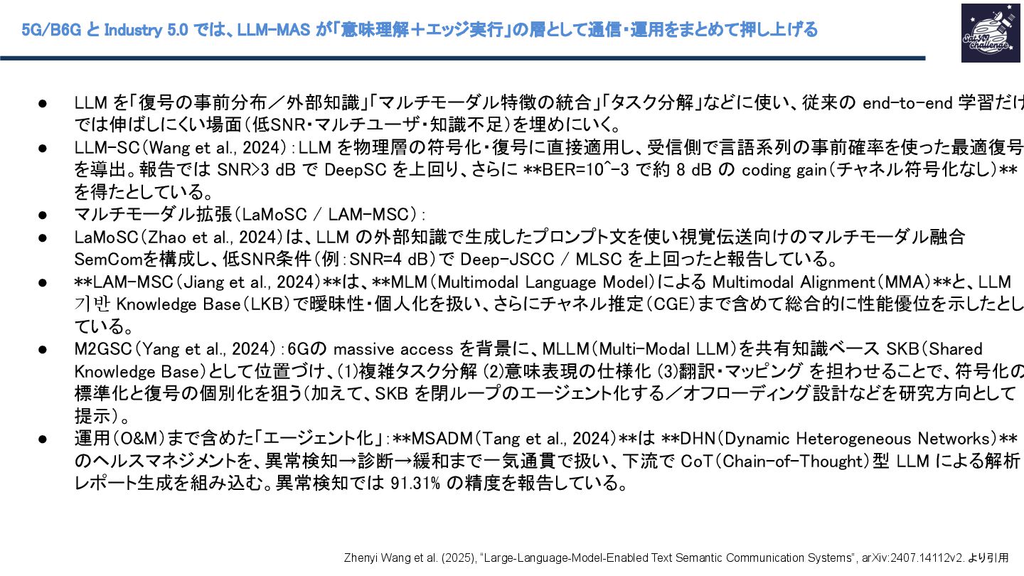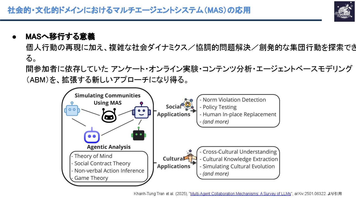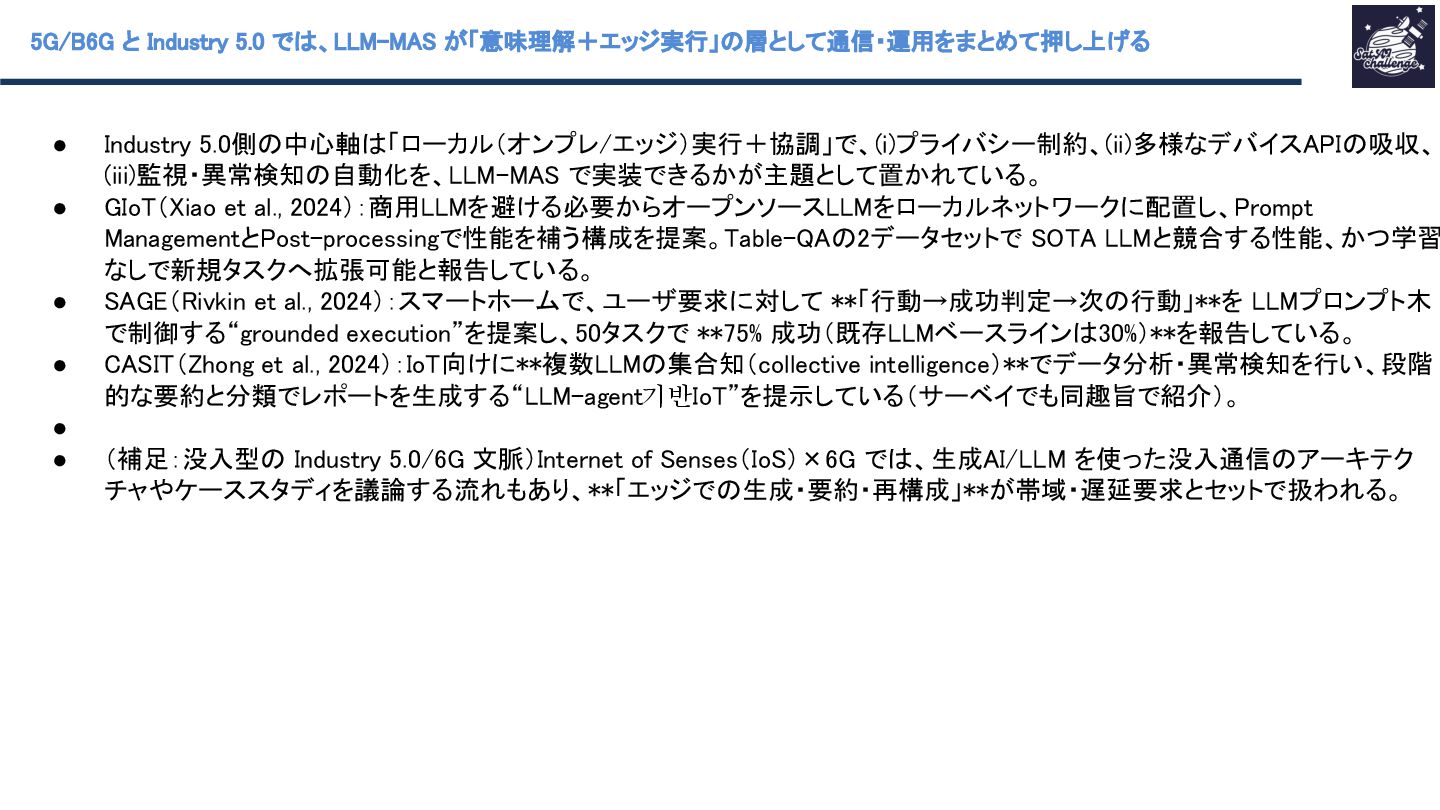 ▪ 5G/B6G(B6G=Beyond 6G)と Industry 5.0 を「LLM がエッジネットワーク性能を高める」代 表的応用領域として同じ節で整理している(通信性能だけでなく、運用・自動化も含む)。 ◦ Question Answering / Natural Language Generation (QA/NLG) ◦ Social and Cultural Domains ▪ AIエージェントを題材に人間社会の社会・文化的振る舞いをシミュレーション Khanh-Tung Tran et al. (2025), “Multi-Agent Collaboration Mechanisms: A Survey of LLMs”, arXiv:2501.06322. より引用