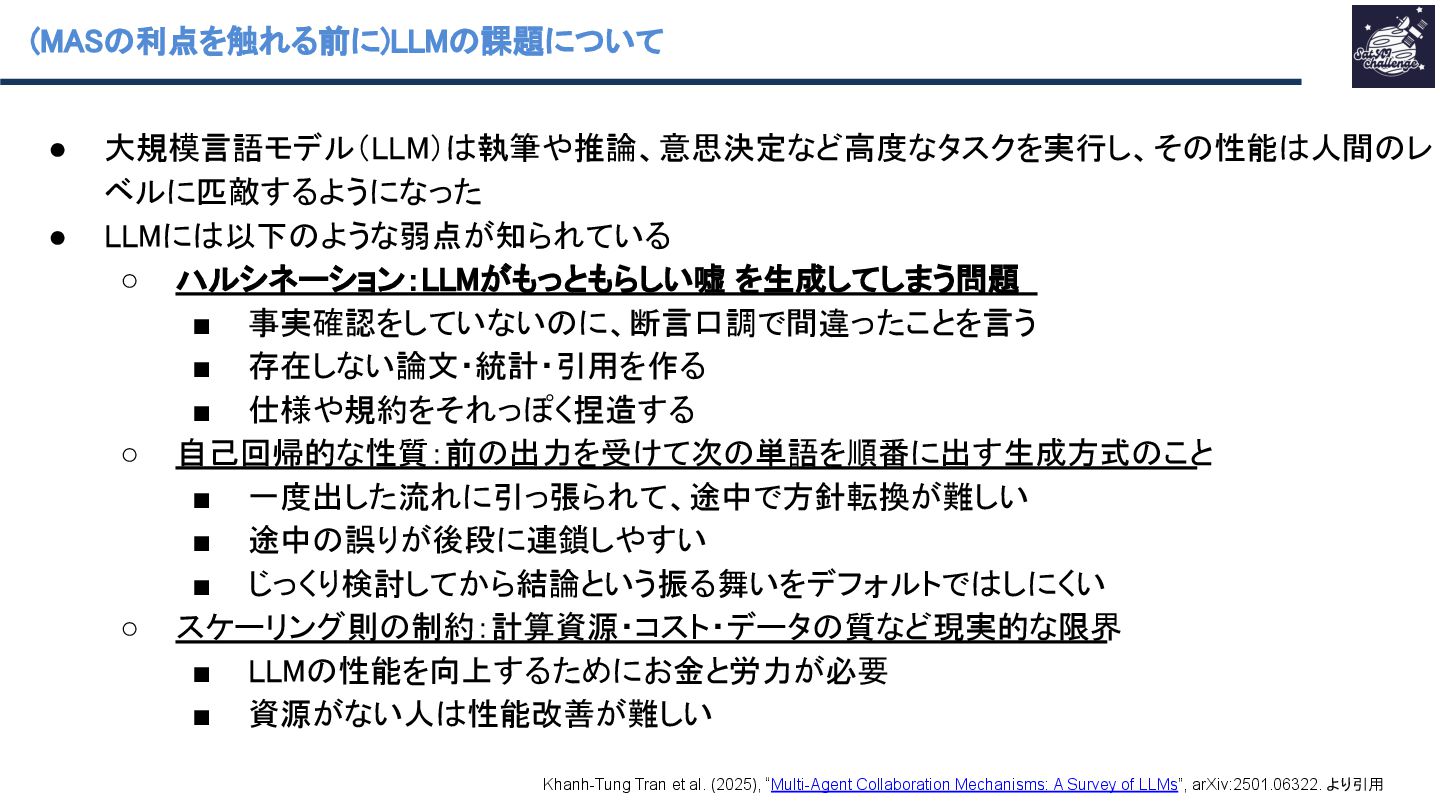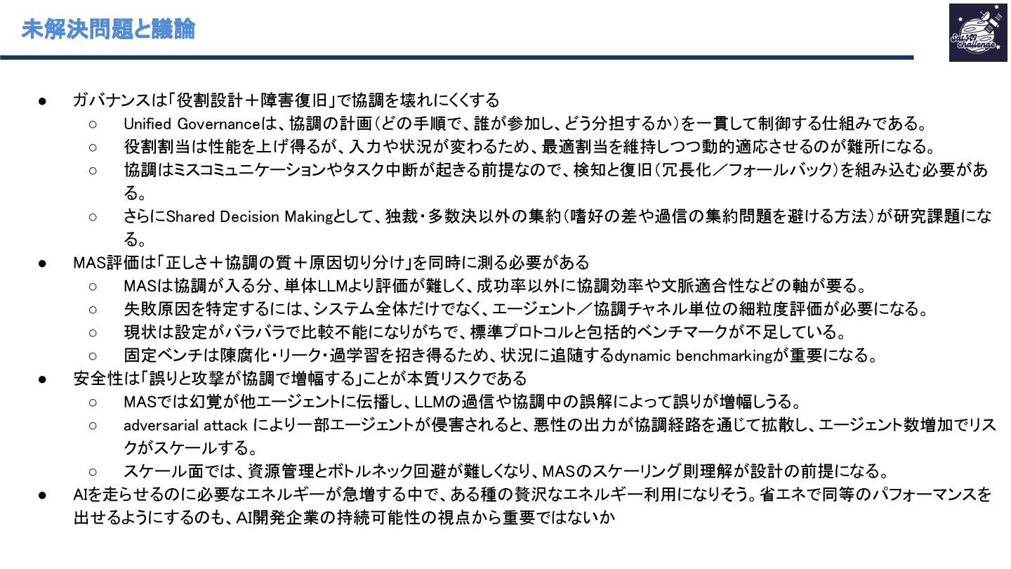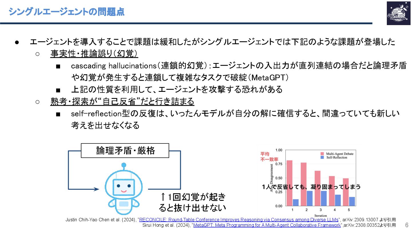 や幻覚が発生すると連鎖して複雑なタスクで破綻(MetaGPT) ▪ 上記の性質を利用して、エージェントを攻撃する恐れがある ◦ 熟考・探索が“自己反省”だと行き詰まる ▪ self-reflection型の反復は、いったんモデルが自分の解に確信すると、間違っていても新しい 考えを出せなくなる 論理矛盾・厳格 ↑1回幻覚が起き ると抜け出せない Justin Chih-Yao Chen et al. (2024), “RECONCILE: Round-Table Conference Improves Reasoning via Consensus among Diverse LLMs”, arXiv:2309.13007 より引用 Sirui Hong et al. (2024), “MetaGPT: Meta Programming for A Multi-Agent Collaborative Framework”,arXiv:2308.00352より引用